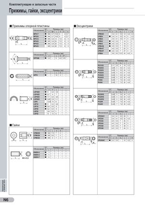 Комплектующие и запасные части СкладСкладСкладСкладСкладСклад СкладСкладСкладСкладСклад Комплектующие и запасные части Прижимы, гайки, эксцентрики Прижимы опорной пластины Эксцентрики Размеры (мм) Размеры (мм) Обозначение d Шаг L D D1 d1 Обозначение d D1 D2 L l B MP317 l M4 0,7 15,5 6 4 3,7 CPB32C 3,3 4,1 5,5 14 3,4 2,5 MP320 l M4 0,7 19,5 6 4 3,7 CPB34 l 3,4 4,1 5,5 14 5 2,5 MP416 l M5 0,8 14 7,5 6 5 CPB35 3,4 4,1 5,5 17 5 2,5 MP420 l M5 0,8 20 7,5 6 5 CPB42 l 4,5 5,5 7 14 5 3 MP432 l M5 0,8 32 7,5 6 5 CPB43 l 4,5 5,5 7 16 5 3 MP445 M5 0,8 45 7,5 6 5 CPB43S l 4,5 5,5 7 19 5 3 CPB44T 4,5 5,5 7 22 5 3 CPB45T l 4,5 5,5 7 27 5 3 Размеры (мм) CPB64 6,8 8,2 10,5 24 6,6 4 Обозначение d - L D θ° – SPP308 l 3,2 – 8 4,8 120 – Размеры (мм) Обозначение d D1 D2 L l - P221US 2,11 3,5 4 18 3,3 – P322US 3,635 5 5,5 21 3,3 – Размеры (мм) P323US 3,635 5 5,5 24 3,3 – Обозначение – – L D – – P332US 3,635 5 5,5 21 4,9 – SPP3 l – – 16 3 – – P333US 3,635 5 5,5 24 4,9 – P334US 3,635 5 5,5 30 4,9 – P433U 5,025 7 7,5 24 4,9 – P434U 5,025 7 7,5 30 4,9 – Размеры (мм) Обозначение d H L – – – Размеры (мм) LSP3SD l 5 3,5 5,5 – – – Обозначение d D1 D2 L l - LSP4SD l 6,7 4 7 – – – P323WS 3,635 5 5,8 24 3,3 – LSP5SD l 7,7 4,5 8,5 – – – P333WS 3,635 5 5,8 24 4,9 – LSP6SD l 9,85 5,9 11,1 – – – P334WS 3,635 5 5,8 30 4,9 – LSP8 13,05 10 12 – – – P433W 5,025 7 7,8 24 4,9 – LSP10 l 5 3,3 6,5 – – – P434W 5,025 7 7,8 30 4,9 – LSP16 l 6,6 4,5 9 – – – LSP20 l 8,2 5,5 9 – – – LSP25 9,8 6,5 11 – – – Размеры (мм) LSP32 13 10 12 – – – Обозначение d D1 D2 L l - CPZ333V 3,4 4,1 5,5 29 5 – CPZ334 3,4 4,1 5,5 32 5,5 – CPZ433 4,5 5,5 7 26 5 – CPZ434 4,5 5,5 7 32 5 – Гайки CPZ435 4,5 5,5 7 39 5 – Размеры (мм) CPZ438 4,5 5,5 7 44 5 – Обозначение d L D B – – CPM32N l M4 7,5 7 3 – – CPM43N l M5 8,5 7 3 – – Размеры (мм) CPM43S l M5 6 7 3 – – Обозначение d D1 D2 L l B CPU304C l 3,3 5,5 – 10 3,5 3 Размеры (мм) Обозначение L – – – – – BNBW-2 l 3 – – – – – BNBW-4 l 5 – – – – – BNBW-7 l 8 – – – – – N6