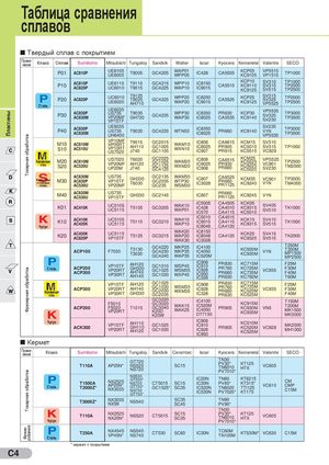 Пластины Токарная обработкаФрезерная обработкаТокарная обработкаФрезе-рование Таблица сравнения сплавов Твердый сплав с покрытием Приме-нение Класс Сплав Sumitomo Mitsubishi Tungaloy Sandvik Walter Iscar Kyocera Kennametal Valenite SECO P01 AC810P UE6105UE6005 T9005 GC4205 WAP01WPP05 IC428 CA5505 KCP05KC9105VP5515VP1510TP1000 P10 AC810PAC820P UE6110 T9115UC6010T9015GC4215WPP10GC4225WAP10IC8150IC9015 KCP10 SV310CA5515KC9110SV315KC9125SV515TP1000TP2000TP2500 P20 AC820PСталь UC6010UE6020 T9125T9025AH710GC4225 WPP20WAP20 IC8250IC9015CA5525 KCP25KC9125SV315SV325VP5525TP2000TP2500 P30 AC830PAC630M UE6035US735 T9035VP20MFGH730VP15TFGC4235WPP30WAP30IC8350IC8025PR630CA5535KCP30KC9140VP5535SV325SV230TP3000TP3500 P40 AC830PAC630M UE6035US735 T9035UH6400 GC4235 WTN53 IC8350IC8025PR660 KC9140 SV235V1NVP5535TP3000TP3500 M10 AC610MS10AC510UVP10MFVP05RTVP10RTUS7020T9015AH110J740GC2015GC1005GC1105WAM10WXN10IC808IC8025IC907CA6615KCM15SV310PR905KC5010SV315PR915KC5510VC929TP1000 Нержавеющая M20 AC610MстальS20AC520UUS7020 T6020VP20MFAH120UP20MJ740GC2025GC1025GC1125GC4125WAM20WXM20IC808IC9025IC908CA6515PR930PR660KCM25KC5525KC9225KC5020VPS525VC901SV230TP2500TM2000 AC630MЖаропрочныеи титановыеM30AC830PсплавыAC530UUS735VP15TFVP20MFGH330T6030GC2135GC2035GC235WAM30WTP30WSM30IC807IC3028CA6525PR660PR1125KCM35KC9240VC901V1NTP3000TM4000 M40 AC630MAC530U US735VP15TF GH330 GC2145 IC807 PR660PR1125KC9245 V1N K01 AC410K UC5105UC5115 T5105 GC3205 WAK10WAP01 IC5005IC428IC570CA4505CA4010CA4115KCK05KC9315KC5010SV405SV510TK1000 Чугун K10 AC410KAC420K UC5105UC5115 T5115 GC3210 WAK10WAP10 IC5010IC9015IC8048CA4515CA4115CA4120KCK15KC9315SV410SV515TK1000 K20 AC420KAC820P UC5115VP15TF T5125 WAK20GC3215WAP20WAK30IC8150IC8048IC3028CA4120KCK20KC9325SV415SV515TK2000 ACP100 F7030 T3130T3030 GC4220 WKP25 IC4100GC4230WKP35IC4050GC4240WAP35IC520M T250MKC930MKC935MV1NT350MMP1500MP2500 Сталь ACP200ACP300 VP15TFVP20RTVP30RTAH120GH330AH740AH140 IC908GC1010WSP45IC910GC1025WSM35IC928GC1030WXP45IC950IC328PR830KC715MF25MPR760PR660KC725MKC735MVC935F30MF40MPR630KC792MT60M Нержавеющая ACP300сталь VP15TF AH120VP20RTAH140VP30RTGH330GC1025GC1030GC2030GC2035WSM35WXM35IC908IC928IC328PR830PR760PR660PR630KC715MKC725MKC520MVC935KC525MF25MF30MF40M ACP200 F5010F5020 T1015VP20RT GC3220GC3020GC3040K20DWAK15WAK25K20WIC4100IC520MIC4050PR905DT7150KC915MKC930MVN5KC935MT150MT200MMK1500MK3000 Чугун ACK300 VP15TFVP20RT AH110GH110AH120GC1025GC1030 IC908IC910IC928IC950PR905KC510MKC520MVC928KC525MMK2000MH1000 Кермет Приме-нение Класс Sumitomo Mitsubishi Tungaloy Sandvik Ceramtec Iscar Kyocera Kennametal Valenite SECO GT720T110AAP25N*NS520 SC15NS720 TN30PV30* KT125TN6010HTXVC605PV7010* Сталь T1500AT2000Z* NS530NX2525AP25N*NX3035GT530*NS720GT720*NS730CT5015SC15GC1525*SC35GT730*IC20NTN60KT6215IC30NIC520NPV60*KT315*TN6020TTI125VC610IC530NPV7020*KT175CMCMPC15M T3000Z* NX3035NX99 NS540 SC35SC45 TN90PV90* TN30 Чугун T110A NX2525NX25N* NS520 CT5015 SC15SC35 PV30* KT125TN6010HTXVC605PV7010* Сталь T250A NX4545 NS540VP45N*NS740CT530 SC60 IC30N TC60MTN100MKT530M* VC630 C15M * кермет с покрытием C4