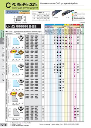 Негативные пластины Черновая обработкаЧерновая обработкаЧерновая обработкаЧерновая обработкаЧерновая обработкаЧерновая обработка Глубина резания, ммГлубина резания, ммГлубина резания, ммГлубина резания, ммГлубина резания, ммГлубина резания, мм T110A T1200A T1500A T2000Z T3000Z AC530U AC700G AC900G AC810P AC820P AC830P AC2000 AC3000 AC610M AC630M AC530U AC510U AC520U AC530U AC410K AC420K AC700G AC900G NB100C G10E H1 C РОМБИЧЕСКИЕ ПЛАСТИНЫ ДЛЯ ТОКАРНОЙ ОБРАБОТКИ Негативные пластины CNMG для черновой обработки 80° Ромбическая 0° Задний уголС отверстием Размеры, ммCNMGlød (IC)sd1 P СтальM Нержавеющая сталь 12 12,9 12,7 4,76 5,16 K Чугун 16 16,1 15,875 6,35 6,35 a D10, D16 a E8 N Цветные металлы 19 19,3 19,05 6,35 7,94 S Жаропрочные и титановые сплавы H Закаленная сталь 1 Керамика CNMG llllll n-nn P M S K HKNКерметТвердый сплав1 Тв. сплавБез покрытия С покрытием ZXС покрытиемС покрытием ZXС покрытиемБез покр. M-Класс Двусторонние, стружколом сложной формы Применение Форма Обозначение ISO r CNMG 120408 NMU 0,8 ssl l lssl l ll ss CNMG 120412 NMU 1,2 ssl l lssl l ll ss CNMG 120416 NMU 1,6 ssl l lss ll ss NMU CNMG 160608 NMU 0,8 ssl l lssl l ss CNMG 160612 NMU 1,2 ssl l lssl l ll ss CNMG 160616 NMU 1,6 ssl l lssl l ll ss CNMG 190608 NMU 0,8 l CNMG 190612 NMU 1,2 l l lssl l ll Подача, мм/об CNMG 190616 NMU 1,6 l l lssl l ll Новый CNMG 120408 NME 0,8CNMG 120412 NME1,2 llllll NME CNMG 160612 NME 1,2 lll CNMG 160616 NME 1,6 lll Подача, мм/об CNMG 190616 NME 1,6 lll CNMG 120404 NUX 0,4 l lss l CNMG 120408 NUX 0,8 ssl l lss l ss CNMG 120412 NUX 1,2 ssl l lss l ss CNMG 120416 NUX 1,6 ssl l ls l ss NUX CNMG 160608 NUX 0,8 ssl l l l ss CNMG 160612 NUX 1,2 ssl l ls l ss CNMG 160616 NUX 1,6 ssl l ls l ss CNMG 190608 NUX 0,8 l Подача, мм/об CNMG 190612 NUX 1,2CNMG 190616 NUX1,6 ll llll CNMG 120408 NMX 0,8 l lss CNMG 120412 NMX 1,2 l lss CNMG 120416 NMX 1,6 l lss NMX CNMG 160608 NMX 0,8 l CNMG 160612 NMX 1,2 l lss CNMG 160616 NMX 1,6 l lss CNMG 190612 NMX 1,2 lls Подача, мм/об CNMG 190616 NMX 1,6 lls Новый CNMG 120408 NGZ 0,8 l CNMG 120412 NGZ 1,2 l NGZ CNMG 120416 NGZ 1,6 l Подача, мм/об CNMG 120404 NUZ 0,4 l CNMG 120408 NUZ 0,8 l lss CNMG 120412 NUZ 1,2 l lss NUZ CNMG 120416 NUZCNMG 160608 NUZ 1,60,8 l lssl CNMG 160612 NUZ 1,2 l lss CNMG 160616 NUZ 1,6 l lss CNMG 190612 NUZ 1,2 ll Подача, мм/об CNMG 190616 NUZ 1,6 ll l = Европейский склад l = Первый выбор C12 l = Склад в Японииs = Будет заменен новой позицией Упаковочная единица и пример заказа; 10 шт. CNMG 120408 NMU, AC820P