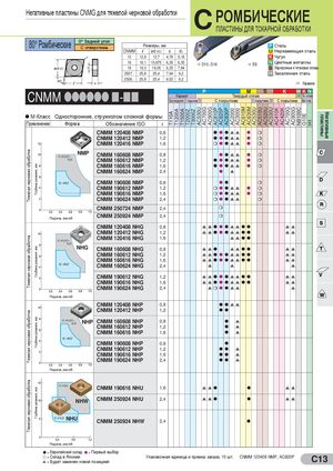 Тяжелая черновая обработкаТяжелая черновая обработкаТяжелая черновая обработкаТяжелая черновая обработка Глубина резания, ммГлубина резания, ммГлубина резания, ммГлубина резания, мм T110A T1200A T1500A T2000Z T3000Z AC530U AC700G AC900G AC810P AC820P AC830P AC2000 AC3000 AC610M AC630M AC530U AC510U AC520U AC530U AC410K AC420K AC700G AC900G NB100C G10E H1 пластины Негативные Негативные пластины CNMG для тяжелой черновой обработки C РОМБИЧЕСКИЕ ПЛАСТИНЫ ДЛЯ ТОКАРНОЙ ОБРАБОТКИ 80° Ромбические 0° Задний уголС отверстием Размеры, ммCNMMlød (IC)sd1 P СтальM Нержавеющая сталь 12 12,9 12,7 4,76 5,16 K Чугун 16 16,1 15,875 6,35 6,35 a D10, D16 a E8 N Цветные металлы 19 19,3 19,05 6,35 7,94 S Жаропрочные и титановые сплавы 2507.. 25,8 25,4 7,94 9,2 H Закаленная сталь 2509.. 25,8 25,4 9,52 9,2 1 Керамика CNMM llllll n-nn P M S K HKNКерметТвердый сплав1 Тв. сплавБез покрытия С покрытием ZXС покрытиемС покрытием ZXС покрытиемБез покр. M-Класс Односторонние, стружколом сложной формы Применение Форма Обозначение ISO r CNMM 120408 NMP 0,8 l l lss l m CNMM 120412 NMP 1,2 l l lss l m CNMM 120416 NMP 1,6 ml lss l m NMP CNMM 160608 NMP 0,8 l lss l m CNMM 160612 NMP 1,2 l l lss l m CNMM 160616 NMP 1,6 l l lss l m CNMM 160624 NMP 2,4 l s CNMM 190608 NMP 0,8 ll m CNMM 190612 NMP 1,2 ml lss l m CNMM 190616 NMP 1,6 ml lss l m CNMM 190624 NMP 2,4 ml lss m CNMM 250724 NMP 2,4 m Подача, мм/об CNMM 250924 NMP 2,4 m CNMM 120408 NHG 0,8 ssl l lssl l ss CNMM 120412 NHG 1,2 ssl l lssl l ss CNMM 120416 NHG 1,6 ssl l NHG CNMM 160608 NHG 0,8 ssl ssl l ss CNMM 160612 NHG 1,2 ssl l lssl l ss CNMM 160616 NHG 1,6 ssl l lssl l ss CNMM 160624 NHG 2,4 s s s CNMM 190612 NHG 1,2 ssl l lssl l ss CNMM 190616 NHG 1,6 ssl l lssl l ss CNMM 190624 NHG 2,4 sml lss s Подача, мм/об CNMM 120408 NHP 0,8 l lss CNMM 120412 NHP 1,2 ll NHP CNMM 160608 NHP 0,8 l s CNMM 160612 NHP 1,2 l s CNMM 160616 NHP 1,6 l s CNMM 190608 NHP 0,8 l CNMM 190612 NHP 1,2 ll s CNMM 190616 NHP 1,6 ll s CNMM 190624 NHP 2,4 ll s Подача, мм/об CNMM 190616 NHU 1,6 ssl l ss NHW CNMM 250924 NHU 2,4 ssl l ss NHU CNMM 250924 NHW 2,4 l Подача, мм/об l = Европейский склад l = Первый выбор l = Склад в Японииs = Будет заменен новой позицией Упаковочная единица и пример заказа; 10 шт. CNMM 120408 NMP, AC820P C13