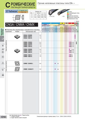 Негативные пластины Черновая обработкаТяжелая черновая обработка T110A T1200A T1500A T2000Z T3000Z AC530U AC700G AC900G AC810P AC820P AC830P AC2000 AC3000 AC610M AC630M AC530U AC510U AC520U AC530U AC410K AC420K AC700G AC900G NB100C G10E H1 C РОМБИЧЕСКИЕ ПЛАСТИНЫ ДЛЯ ТОКАРНОЙ ОБРАБОТКИ Прочие негативные пластины типа CN– – 80° Ромбические 0° Задний уголС отверстием Размеры, ммCN – –lød (IC)sd1 P СтальM Нержавеющая сталь 12 12,9 12,7 4,76 5,16 K Чугун 16 16,1 15,875 6,35 6,35 a D10, D16 a E8 N Цветные металлы 19 19,3 19,05 6,35 7,94 S Жаропрочные и титановые сплавы H Закаленная сталь 1 Керамика CNGA / CNMA / CNMX P M S K HKNКерметТвердый сплав1 Тв. сплавБез покрытия С покрытием ZXС покрытиемС покрытием ZXС покрытиемБез покр. Пластины без стружколома и направленные пластины Применение Форма Обозначение ISO r CNGA 120408 0,8 l CNGA 120412 1,2 l CNGA 120416 1,6 l CNMA 120404 0,4 l lss l CNMA 120408 0,8 l lss l CNMA 120412 1,2 l lss CNMA 120416 1,6 l lss CNMA 160608 0,8 l ss CNMA 160612 1,2 l lss CNMA 160616 1,6 l lss CNMA 190612 1,2 lls CNMA 190616 1,6 lls CNMX 120408 L 0,8 l s CNMX 120408 R 0,8 l s l = Европейский склад l = Первый выбор C14 l = Склад в Японииs = Будет заменен новой позицией Упаковочная единица и пример заказа; 10 шт. CNGA 120408, NB100C