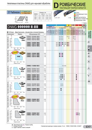 Черновая обработкаЧерновая обработкаЧерновая обработкаЧерновая обработкаЧерновая обработкаЧерновая обработка Глубина резания, ммГлубина резания, ммГлубина резания, ммГлубина резания, ммГлубина резания, ммГлубина резания, мм T110A T1200A T1500A T2000Z T3000Z AC530U AC700G AC900G AC810P AC820P AC830P AC2000 AC3000 AC610M AC630M AC530U AC510U AC520U AC530U AC410K AC420K AC700G AC900G NB100C G10E H1 пластины Негативные Негативные пластины DNMG для черновой обработки D РОМБИЧЕСКИЕ ПЛАСТИНЫ ДЛЯ ТОКАРНОЙ ОБРАБОТКИ 55° Ромбические 0° Задний уголС отверстием Размеры, ммDNMGlød (IC)sd1 P СтальM Нержавеющая сталь 1104 - - 11,6 9,525 4,76 3,81 K Чугун 1504- - 15,5 12,7 4,76 5,16 a D11, D17 a E9 N Цветные металлы 1506 - - 15,5 12,7 6,35 5,16 S Жаропрочные и титановые сплавы H Закаленная сталь 1 Керамика DNMG llllll n-nn P M S K HKNКерметТвердый сплав1 Тв. сплавБез покрытия С покрытием ZXС покрытиемС покрытием ZXС покрытиемБез покр. M-Класс Двусторонние, стружколом сложной формы Применение Форма Обозначение ISO r DNMG 150408 NMU 0,8 mmm mm mm DNMG 150412 NMU 1,2 mmm m mm NMU DNMG 150416 NMU 1,6 mmm m DNMG 150608 NMU 0,8 ssl l lssl l DNMG 150612 NMU 1,2 ssl l lssl l DNMG 150616 NMU 1,6 ssl l s ll Подача, мм/об Новый DNMG 150608 NME 0,8 lll DNMG 150612 NME 1,2 lll NME DNMG 150616 NME 1,6 lll Подача, мм/об DNMG 110408 NUX 0,8 mss DNMG 150404 NUX 0,4 mmm DNMG 150408 NUX 0,8 mmm NUX DNMG 150412 NUX 1,2 mmm DNMG 150604 NUX 0,4 lls l DNMG 150608 NUX 0,8 mlls l Подача, мм/об DNMG 150612 NUX 1,2DNMG 150616 NUX1,6 mlls llsl DNMG 150408 NMX 0,8 mm NMX DNMG 150412 NMX 1,2 mm DNMG 150608 NMX 0,8 l DNMG 150612 NMX 1,2 l Подача, мм/об Новый DNMG 150608 NGZ 0,8 l NGZ DNMG 150612 NGZ 1,2 l Подача, мм/об DNMG 150608 NUZ 0,8 lls NUZ DNMG 150612 NUZ 1,2 lls Подача, мм/об l = Европейский склад l = Первый выбор l = Склад в Японииs = Будет заменен новой позицией Упаковочная единица и пример заказа; 10 шт. DNMG 150608 NMU, AC820P C17
