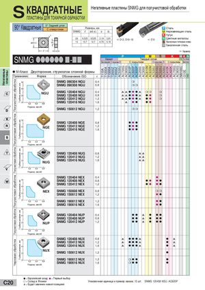 Негативные пластины Получистовая обработкаПолучистовая обработкаПолучистовая обработкаобработкаПолучистоваяПолучистовая обработкаЧерновая обработка Глубина резания, ммГлубина резания, ммГлубина резания, ммГлубина резания, ммГлубина резания, ммГлубина резания, мм T110A T1200A T1500A T2000Z T3000Z AC530U AC700G AC900G AC810P AC820P AC830P AC2000 AC3000 AC610M AC630M AC530U AC510U AC520U AC530U AC410K AC420K AC700G AC900G NB100C G10E H1 S КВАДРАТНЫЕ ПЛАСТИНЫ ДЛЯ ТОКАРНОЙ ОБРАБОТКИ Негативные пластины SNMG для получистовой обработки 90° Квадратные 0° Задний уголС отверстием Размеры, ммSNMGlød (IC)sd1 P СтальM Нержавеющая сталь K Чугун 09 9,525 9,525 3,18 3,81 a D12, D18~19 a E10 N Цветные металлы 12 12,7 12,7 4,76 5,16 S Жаропрочные и титановые сплавы H Закаленная сталь 1 Керамика SNMG llllll n-nn P M S K HKNКерметТвердый сплав1 Тв. сплавБез покрытия С покрытием ZXС покрытиемС покрытием ZXС покрытиемБез покр. M-Класс Двусторонние, стружколом сложной формы Применение Форма Обозначение ISO r SNMG 090304 NGU 0,4 m SNMG 090308 NGU 0,8 mm NGU SNMG 120404 NGUSNMG 120408 NGU 0,40,8 ssl l ls mm mssl l lsllm SNMG 120412 NGU 1,2 ssl l ls ll m SNMG 120416 NGU 1,6 s ll ll Подача, мм/об SNMG 150612 NGU 1,2 mm SNMG 120408 NGE 0,8 lll NGE SNMG 120412 NGESNMG 120416 NGE 1,21,6 llllll Подача, мм/об SNMG 120408 NUG 0,8 ss SNMG 120412 NUG 1,2 ss NUG SNMG 120416 NUG 1,6 ss Подача, мм/об SNMG 120404 NEX 0,4 l SNMG 120408 NEX 0,8 ll ll SNMG 120412 NEX 1,2 ll ll NEX SNMG 150608 NEX 0,8 mm SNMG 150612 NEX 1,2 ll SNMG 190612 NEX 1,2 ll Подача, мм/об SNMG 190616 NEX 1,6 ll SNMG 120404 NUP 0,4 ll s l ll SNMG 120408 NUP 0,8 ll s l ll NUP SNMG 120412 NUP 1,2 ll s l ll Подача, мм/об SNMG 120408 NUX 0,8 s llls l s SNMG 120412 NUX 1,2 s llls l s SNMG 120416 NUX 1,6 s llls l s NUX SNMG 150612 NUX 1,2 l SNMG 190612 NUX 1,2 mll l SNMG 190616 NUX 1,6 mll l Подача, мм/об l = Европейский склад l = Первый выбор C20 l = Склад в Японииs = Будет заменен новой позицией Упаковочная единица и пример заказа; 10 шт. SNMG 120408 NSU, AC820P