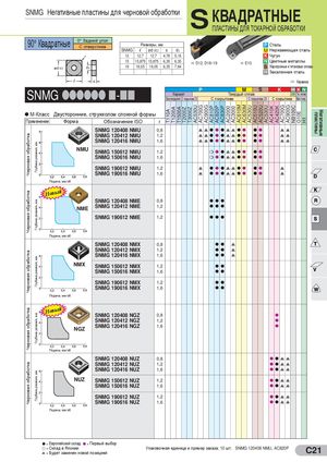 Черновая обработкаЧерновая обработкаЧерновая обработкаЧерновая обработкаЧерновая обработка Глубина резания, ммГлубина резания, ммГлубина резания, ммГлубина резания, ммГлубина резания, мм T110A T1200A T1500A T2000Z T3000Z AC530U AC700G AC900G AC810P AC820P AC830P AC2000 AC3000 AC610M AC630M AC530U AC510U AC520U AC530U AC410K AC420K AC700G AC900G NB100C G10E H1 пластины Негативные SNMG Негативные пластины для черновой обработки S КВАДРАТНЫЕ ПЛАСТИНЫ ДЛЯ ТОКАРНОЙ ОБРАБОТКИ 90° Квадратные 0° Задний уголС отверстием Размеры, ммSNMGlød (IC)sd1 P СтальM Нержавеющая сталь 12 12,7 12,7 4,76 5,16 K Чугун 15 15,875 15,875 6,35 6,35 a D12, D18~19 a E10 N Цветные металлы 19 19,05 19,05 6,35 7,94 S Жаропрочные и титановые сплавы H Закаленная сталь 1 Керамика SNMG llllll n-nn P M S K HKNКерметТвердый сплав1 Тв. сплавБез покрытия С покрытием ZXС покрытиемС покрытием ZXС покрытиемБез покр. M-Класс Двусторонние, стружколом сложной формы Применение Форма Обозначение ISO r SNMG 120408 NMU 0,8 ssl l lssl l ll ss SNMG 120412 NMU 1,2 ssl l lssl l ll ss SNMG 120416 NMU 1,6 ssl l lssl l ll ss NMU SNMG 150612 NMU 1,2 ml lssl l ll SNMG 150616 NMU 1,6 ml lssl l ll SNMG 190612 NMU 1,2 s l l lssl l ll s SNMG 190616 NMU 1,6 s l l lssl l ll s Подача, мм/об Новый SNMG 120408 NME 0,8 lll NME SNMG 120412 NME 1,2 lll SNMG 190612 NME 1,2 lll Подача, мм/об SNMG 120408 NMX 0,8 ll s SNMG 120412 NMX 1,2 ll s SNMG 120416 NMX 1,6 ll s NMX SNMG 150612 NMX 1,2 ll SNMG 150616 NMX 1,6 ll SNMG 190612 NMX 1,2 ll SNMG 190616 NMX 1,6 ll Подача, мм/об Новый SNMG 120408 NGZ 0,8 l SNMG 120412 NGZ 1,2 l NGZ SNMG 120416 NGZ 1,6 l Подача, мм/об SNMG 120408 NUZ 0,8 l lss SNMG 120412 NUZ 1,2 l lss SNMG 120416 NUZ 1,6 l lss NUZ SNMG 150612 NUZ 1,2 l lss SNMG 150616 NUZ 1,6 l lss SNMG 190612 NUZ 1,2 l lss SNMG 190616 NUZ 1,6 l lss Подача, мм/об l = Европейский склад l = Первый выбор l = Склад в Японииs = Будет заменен новой позицией Упаковочная единица и пример заказа; 10 шт. SNMG 120408 NMU, AC820P C21