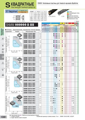 Негативные пластины Тяжелая черновая обработкаТяжелая черновая обработкаТяжелая черновая обработкаТяжелая черновая обработка Глубина резания, ммГлубина резания, ммГлубина резания, ммГлубина резания, мм T110A T1200A T1500A T2000Z T3000Z AC530U AC700G AC900G AC810P AC820P AC830P AC2000 AC3000 AC610M AC630M AC530U AC510U AC520U AC530U AC410K AC420K AC700G AC900G NB100C G10E H1 S КВАДРАТНЫЕ ПЛАСТИНЫ ДЛЯ ТОКАРНОЙ ОБРАБОТКИ SNMM Негативные пластины для тяжелой черновой обработки 90° Квадратные 0° Задний уголС отверстиемSNMM l ød (IC) s d1 P Сталь 12 12,7 12,7 4,76 5,16 M Нержавеющая сталь 15 15,875 15,875 6,35 6,35 K Чугун 19 19,05 19,05 6,35 7,94 a D12, D18~19 a E10 N Цветные металлы 2507.. 25,4 25,4 7,94 9,2 S Жаропрочные и титановые сплавы 2509.. 25,4 25,4 9,52 9,2 H Закаленная сталь 3109.. 31,75 31,75 9,52 8,8 1 Керамика SNMM llllll n-nn P M S K HKNКерметТвердый сплав1 Тв. сплавБез покрытия С покрытием ZXС покрытиемС покрытием ZXС покрытиемБез покр. M-Класс Односторонние, стружколом сложной формы Применение Форма Обозначение ISO r SNMM 120408 NMP 0,8 l l lss l m SNMM 120412 NMP 1,2 l l lss l m SNMM 120416 NMP 1,6 ml lss l m NMP SNMM 120420 NMP 2,0 l lss SNMM 150612 NMP 1,2 l l lss l SNMM 150616 NMP 1,6 l l lss l SNMM 190612 NMP 1,2 l l lss l m SNMM 190616 NMP 1,6 l l lss l m SNMM 190624 NMP 2,4 l lss SNMM 250724 NMP 2,4 mml m Подача, мм/об SNMM 250924 NMP 2,4 mm m SNMM 310924 NMP 2,4 mm m SNMM 120408 NHG 0,8 ssl l lssml ss SNMM 120412 NHG 1,2 ssl l lssml ss SNMM 120416 NHG 1,6 ssl l lssml ss NHG SNMM 150612 NHG 1,2 ssl ss l ss SNMM 150616 NHG 1,6 sslm ss l ss SNMM 190612 NHG 1,2 ml lssml SNMM 190616 NHG 1,6 ml lssl l SNMM 190624 NHG 2,4 l lss m Подача, мм/об SNMM 120408 NHP 0,8 ll s SNMM 120412 NHP 1,2 ll s SNMM 120416 NHP 1,6 l NHP SNMM 150612 NHP 1,2 s SNMM 190612 NHP 1,2 l ss m SNMM 190616 NHP 1,6 l lss m SNMM 190624 NHP 2,4 l lss SNMM 250724 NHP 2,4 mml m SNMM 250924 NHP 2,4 mm m Подача, мм/об SNMM 310924 NHP 2,4 mm m SNMM 190616 NHU 1,6 ss l ss SNMM 250724 NHU 2,4 sslm l ss NHW SNMM 250924 NHU 2,4 sslm l ss SNMM 310924 NHU 2,4 slm m s NHU SNMM 190616 NHW 1,6 ss l ss SNMM 250724 NHW 2,4 ss m l ss SNMM 250924 NHW 2,4 ss m l ss Подача, мм/об SNMM 310924 NHW 2,4 m m s l = Европейский склад l = Наиболее рекомендуемая позиция C22 l = Склад в Японииs = Будет заменен новой позицией Упаковочная единица и пример заказа; 10 шт. SNMM 120408 NMP, AC820P
