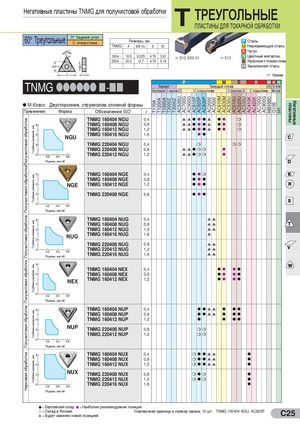 Получистовая обработкаПолучистовая обработкаПолучистовая обработкаПолучистовая обработкаПолучистовая обработкаЧерновая обработка Глубина резания, ммГлубина резания, ммГлубина резания, ммГлубина резания, ммГлубина резания, ммГлубина резания, мм T110A T1200A T1500A T2000Z T3000Z AC530U AC700G AC900G AC810P AC820P AC830P AC2000 AC3000 AC610M AC630M AC530U AC510U AC520U AC530U AC410K AC420K AC700G AC900G NB100C G10E H1 пластины Негативные Негативные пластины TNMG для получистовой обработки T ТРЕУГОЛЬНЫЕ ПЛАСТИНЫ ДЛЯ ТОКАРНОЙ ОБРАБОТКИ 60° Треугольные 0° Задний уголС отверстием Размеры, ммTNMGlød (IC)sd1 P СтальM Нержавеющая сталь K Чугун 1604 - - 16,5 9,525 4,76 3,81 a D13, D20~21 a E12 N Цветные металлы 2204 - - 22,0 12,7 4,76 5,16 S Жаропрочные и титановые сплавы H Закаленная сталь 1 Керамика TNMG llllll n-nn P M S K HKNКерметТвердый сплав1 Тв. сплавБез покрытия С покрытием ZXС покрытиемС покрытием ZXС покрытиемБез покр. M-Класс Двусторонние, стружколом сложной формы Применение Форма Обозначение ISO r TNMG 160404 NGU 0,4 ssl l ls ll m TNMG 160408 NGU 0,8 ssl l ls ll m TNMG 160412 NGU 1,2 ssl l ls ll m NGU TNMG 160416 NGU 1,6 ll TNMG 220404 NGU 0,4 m mm TNMG 220408 NGU 0,8 sslmm l TNMG 220412 NGU 1,2 sslmm l Подача, мм/об TNMG 160404 NGE 0,4 llm TNMG 160408 NGE 0,8 lll NGE TNMG 160412 NGE 1,2 lll TNMG 220408 NGE 0,8 lll Подача, мм/об TNMG 160404 NUG 0,4 ss TNMG 160408 NUG 0,8 ss TNMG 160412 NUG 1,2 ss NUG TNMG 160416 NUG 1,6 s TNMG 220408 NUG 0,8 ss TNMG 220412 NUG 1,2 ss Подача, мм/об TNMG 220416 NUG 1,6 ss TNMG 160404 NEX 0,4 ll ll TNMG 160408 NEX 0,8 ll ll NEX TNMG 160412 NEX 1,2 ll ll Подача, мм/об TNMG 160404 NUP 0,4 l lss l ll TNMG 160408 NUP 0,8 l lss l ll TNMG 160412 NUP 1,2 l l ll NUP TNMG 220408 NUP 0,8 mm TNMG 220412 NUP 1,2 mm Подача, мм/об TNMG 160404 NUX 0,4 ml lss l TNMG 160408 NUX 0,8 ml lss l TNMG 160412 NUX 1,2 ml lss l NUX TNMG 220408 NUX 0,8 mlm l TNMG 220412 NUX 1,2 mlm l TNMG 220416 NUX 1,6 l Подача, мм/об l = Европейский склад l = Наиболее рекомендуемая позиция l = Склад в Японииs = Будет заменен новой позицией Упаковочная единица и пример заказа; 10 шт. TNMG 160404 NGU, AC820P C25