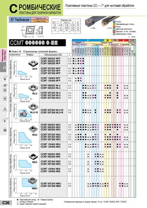 Позитивные пластины Чистовая обработкаЧистовая обработкаЧистовая обработкаЧистовая обработкаПолучистовая обработка Глубина резания, ммГлубина резания, ммГлубина резания, ммГлубина резания, ммГлубина резания, ммГлубина резания, мм T110A T1200A T1500A T2000Z T3000Z AC530U AC700G AC900G AC810P AC820P AC830P AC2000 AC3000 AC610M AC630M AC530U AC510U AC520U AC530U AC410K AC420K AC700G AC900G NB100C G10E H1 C РОМБИЧЕСКИЕ ПЛАСТИНЫ ДЛЯ ТОКАРНОЙ ОБРАБОТКИ Позитивные пластины CC– – 7° для чистовой обработки 80° Ромбические 7° Задний уголС отверстием Размеры, ммCC – –lød (IC)sd1066,456,352,382,8 P СтальM Нержавеющая сталь 09T3 -- 9,7 9,525 3,97 4,41212,912,74,765,5 a D29 a E14 K ЧугунN Цветные металлы S Жаропр. и тит. сплавы H Закаленная сталь 1 Керамика CCMT llllll l-nn P M S K HKNКерметТвердый сплав1Тв. сплавБез покрытияС покрытием ZXС покрытиемС покрытием ZXС покрытиемБез покр. Класс M Стружколом сложной формы Применение Форма Обозначение ISO r CCMT 060202 NFP 0,2 lsl l l CCMT 060204 NFP 0,4 lsl l l CCMT 060208 NFP 0,8 lsl l l NFP CCMT 09T302 NFP 0,2 lsl l l CCMT 09T304 NFP 0,4 lsl l l CCMT 09T308 NFP 0,8 lsl l l Подача, мм/об CCMT 120404 NFP 0,4 sll CCMT 120408 NFP 0,8 sll CCMT 060202 NLU 0,2 l lsslm lll l ss CCMT 060204 NLU 0,4 l lsslm lll l ss NLU CCMT 09T302 NLU 0,2 ll l l CCMT 09T304 NLU 0,4 l lssl l lll l ss CCMT 09T308 NLU 0,8 l lssl l lll l ss Подача, мм/об CCMT 09T304 NLU-W 0,4 l lss l lll ll ss NLU-W CCMT 09T308 NLU-W 0,8 l lss l lll ll ss Подача, мм/об CCMT 060202 NSU 0,2 sl l l lssl lm lllllll ss CCMT 060204 NSU 0,4 sl l l lssl lm lllllll ss CCMT 060208 NSU 0,8 sl l l lssl lm lll l ss NSU CCMT 09T302 NSU 0,2 sll l lm l l l CCMT 09T304 NSU 0,4 sl l l lssl lm lllllll ss CCMT 09T308 NSU 0,8 sl l l lssl lm lllllll ss CCMT 120404 NSU 0,4 lssl lm lll ll ss Подача, мм/об CCMT 120408 NSU 0,8 lssl lm lll ll ss CCMT 060204 NSK 0,4 s l lss CCMT 060208 NSK 0,8 s l lss NSK CCMT 09T304 NSK 0,4 s l lss CCMT 09T308 NSK 0,8 s l lss CCMT 120404 NSK 0,4 s l lss CCMT 120408 NSK 0,8 s l lss Подача, мм/об CCMT 09T304 NMU 0,4 ssl l lssl l l lss CCMT 09T308 NMU 0,8 ssl l lssl l l lss NMU Подача, мм/об l = Европейский склад l = Первый выбор C36 l = Склад в Японииs = Будет заменен новой позицией Упаковочная единица и пример заказа; 10 шт. CCMT 060202 NFP, T2000Z