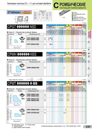 Чистовая-получистовая обработкаЧистовая обработкаЧистовая обработкаЧистовая обработка Глубина резания, ммГлубина резания, ммГлубина резания, ммГлубина резания, мм T110AT110AT110A T1200AT1200AT1200A T1500AT1500AT1500A T2000ZT2000ZT2000Z T3000ZT3000ZT3000Z AC530UAC530UAC530U AC700GAC700GAC700G AC900GAC900GAC900G AC810PAC810PAC810P AC820PAC820PAC820P AC830PAC830PAC830P AC2000AC2000AC2000 AC3000AC3000AC3000 AC610MAC610MAC610M AC630MAC630MAC630M AC530UAC530UAC530U AC510UAC510UAC510U AC520UAC520UAC520U AC530UAC530UAC530U AC410KAC410KAC410K AC420KAC420KAC420K AC700GAC700GAC700G AC900GAC900GAC900G NB100CNB100CNB100C G10EG10EG10E H1H1H1 пластины Позитивные Позитивные пластины CC– – 11° для чистовой обработки C РОМБИЧЕСКИЕ ПЛАСТИНЫ ДЛЯ ТОКАРНОЙ ОБРАБОТКИ 80° Ромбические 11° Задний уголС отверстием Размеры, ммCP– –lød (IC)sd1 P Сталь 0602 - - 6,45 6,35 2,38 2,8 M Нержавеющая сталь 0802 - - 8,1 7,94 2,38 3,4 K Чугун 0903 - - 9,7 9,525 3,18 4,4 a E15 N Цветные металлы 09T3 - - 3,97 S Жаропр. и тит. сплавы H Закаленная сталь 1 Керамика CPGT llllll NSD P M S K HKNКерметТвердый сплав1Тв. сплавБез покрытияС покрытием ZXС покрытиемС покрытием ZXС покрытиемБез покр. Класс G Стружколом сложной формы Применение Форма Обозначение ISO r CPGT 080202 NSD 0,2 sll CPGT 080204 NSD 0,4 s l NSD CPGT 090304 NSD 0,4 ll Подача, мм/об 1 Керамика CPMH llllll NSS P M S K HKNКерметТвердый сплав1Тв.сплавБез покрытияС покрытием ZXС покрытиемС покрытием ZXС покрытиемБез покр. Класс M Стружколом сложной формы Применение Форма Обозначение ISO r CPMH 090308 NSS 0,8 s NSS Подача, мм/об Форма отверстия в пластине : _ _ _ T / A / W _ _ _H 1 Керамика CPMT llllll l-nn P M S K HKNКерметТвердый сплав1Тв. сплавБез покрытияС покрытием ZXС покрытиемС покрытием ZXС покрытиемБез покр. Класс M Стружколом сложной формы Применение Форма Обозначение ISO r CPMT 080204 NSU 0,4 mmm mm CPMT 080208 NSU 0,8 mmm mm NSU CPMT 090304 NSU 0,4 mmm mm CPMT 090308 NSU 0,8 mmm mm Подача, мм/об CPMT 060204 NUS 0,4 s CPMT 09T308 NUS 0,8 ss NUS Подача, мм/об l = Европейский склад l = Первый выбор l = Склад в Японииs = Будет заменен новой позицией Упаковочная единица и пример заказа; 10 шт. CPGT 080202 NSD, T1200A C37