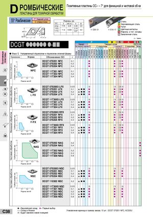 Позитивные пластины Финишная обработкаФинишная обработкаФинишная обработкаЧистовая обработкаЧистовая обработка Глубина резания, ммГлубина резания, ммГлубина резания, ммГлубина резания, ммГлубина резания, мм T110A T1200A T1500A T2000Z T3000Z AC530U AC700G AC900G AC810P AC820P AC830P AC2000 AC3000 AC610M AC630M AC530U AC510U AC520U AC530U AC410K AC420K AC700G AC900G NB100C G10E H1 D РОМБИЧЕСКИЕ ПЛАСТИНЫ ДЛЯ ТОКАРНОЙ ОБРАБОТКИ Позитивные пластины DC– – 7° для финишной и чистовой об-ки 55° Ромбические 7° Задний уголС отверстием Размеры, ммDC – –lød (IC)sd1 P СтальM Нержавеющая сталь 0702 - - 7,75 6,35 2,38 2,8 K Чугун 1103 -- 3,1811,69,5254,4 a D30~31 a E16~17 N Цветные металлы 11T3 -- 3,97 S Жаропр. и тит. сплавы H Закаленная сталь 1 Керамика DCGT llllll l-nn P M S K HKNКерметТвердый сплав1Тв. сплавБез покрытия С покрытием ZXС покрытиемС покрытием ZXС покрытиемБез покр. Класс G Направленный стружколом и стружколом сложной формы Применение Форма Обозначение ISO r DCGT 070201 NFC 0,1 l l ml DCGT 070202 NFC 0,2 l l ml DCGT 070204 NFC 0,4 l l ml NFC DCGT 11T301 NFC 0,1 l l ml DCGT 11T302 NFC 0,2 l l ml DCGT 11T304 NFC 0,4 l l ml Подача, мм/об DCGT 0702003 LFX 0,03 m m mm DCGT 070201 LFX 0,1 sll l l ml DCGT 070202 LFX 0,2 sll l l ml L-FX DCGT 070204 LFX 0,4 sll l l l DCGT 11T3003 LFX 0,03 m m mm DCGT 11T301 LFX 0,1 sll l l ml DCGT 11T302 LFX 0,2 sll l l ml Подача, мм/об DCGT 11T304 LFX 0,4 sll l l l DCGT 0702003 RFX 0,03 m m mm DCGT 070201 RFX 0,1 sll l l ml DCGT 070202 RFX 0,2 sll l l ml DCGT 070204 RFX 0,4 sll l l l R-FX DCGT 11T3003 RFX 0,03 m m mm DCGT 11T301 RFX 0,1 sll l l ml DCGT 11T302 RFX 0,2 sll l l ml Подача, мм/об DCGT 11T304 RFX 0,4 sll l l l DCGT 070202 NAG 0,2 l NAG DCGT 070204 NAG 0,4 l DCGT 11T302 NAG 0,2 l DCGT 11T304 NAG 0.4 l DCGT 11T308 NAG 0.8 l Подача, мм/об DCGT 0702003 NSC 0,03 m m m DCGT 070201 NSC 0,1 sll l l l DCGT 070202 NSC 0,2 sll l l l NSC DCGT 070204 NSC 0,4 sll l l l DCGT 110302 NSC 0,2 sll DCGT 11T3003 NSC 0,03 m m m DCGT 11T301 NSC 0,1 sll l l l Подача, мм/об DCGT 11T302 NSC 0,2 sll l l l DCGT 11T304 NSC 0,4 sll l l l DCGT 11T308 NSC 0,8 sll l l l l = Европейский склад l = Первый выбор C38 l = Склад в Японииs = Будет заменен новой позицией Упаковочная единица и пример заказа; 10 шт. DCGT 070201 NFC, AC530U
