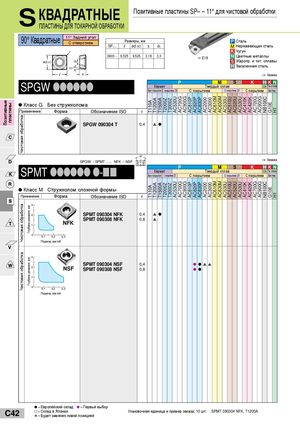 Позитивные пластины Чистовая обработкаЧистовая обработкаЧистовая обработка Глубина резания, ммГлубина резания, мм T110AT110A T1200AT1200A T1500AT1500A T2000ZT2000Z T3000ZT3000Z AC530UAC530U AC700GAC700G AC900GAC900G AC810PAC810P AC820PAC820P AC830PAC830P AC2000AC2000 AC3000AC3000 AC610MAC610M AC630MAC630M AC530UAC530U AC510UAC510U AC520UAC520U AC530UAC530U AC410KAC410K AC420KAC420K AC700GAC700G AC900GAC900G NB100CNB100C G10EG10E H1H1 S КВАДРАТНЫЕ ПЛАСТИНЫ ДЛЯ ТОКАРНОЙ ОБРАБОТКИ Позитивные пластины SP– – 11° для чистовой обработки 90° Квадратные 11° Задний уголС отверстием Размеры, ммSP– –lød (IC)sd1 P СтальM Нержавеющая сталь K Чугун 0903 - - 9,525 9,525 3,18 3,3 a E18 N Цветные металлы S Жаропр. и тит. сплавы H Закаленная сталь 1 Керамика SPGW llllll P M S K HKNКерметТвердый сплав1 Тв.сплавБез покрытия С покрытием ZXС покрытиемС покрытием ZXС покрытиемБез покр. Класс G Без стружколома Применение Форма Обозначение ISO r SPGW 090304 T 0,4 sl SPGW / SPMT ...... NFK / NSF 1 Керамика SPMT llllll l-nn P M S K HKNКерметТвердый сплав1 Тв. сплавБез покрытияС покрытием ZXС покрытиемС покрытием ZXС покрытиемБез покр. Класс M Стружколом сложной формы Применение Форма Обозначение ISO r SPMT 090304 NFK 0,4 sl SPMT 090308 NFK 0,8 s NFK Подача, мм/об SPMT 090304 NSF 0,4 l lss NSF SPMT 090308 NSF 0,8 ll Подача, мм/об l = Европейский склад l = Первый выбор C42 l = Склад в Японииs = Будет заменен новой позицией Упаковочная единица и пример заказа; 10 шт. SPMT 090304 NFK, T1200A