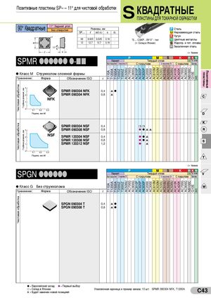 Чистовая обработкаЧистовая обработкаЧистовая обработка Глубина резания, ммГлубина резания, мм T110AT110A T1200AT1200A T1500AT1500A T2000ZT2000Z T3000ZT3000Z AC530UAC530U AC700GAC700G AC900GAC900G AC810PAC810P AC820PAC820P AC830PAC830P AC2000AC2000 AC3000AC3000 AC610MAC610M AC630MAC630M AC530UAC530U AC510UAC510U AC520UAC520U AC530UAC530U AC410KAC410K AC420KAC420K AC700GAC700G AC900GAC900G NB100CNB100C G10EG10E H1H1 пластины Позитивные Позитивные пластины SP– – 11° для чистовой обработки S КВАДРАТНЫЕ ПЛАСТИНЫ ДЛЯ ТОКАРНОЙ ОБРАБОТКИ 90° Квадратные 11° Задний уголБез отверстия Размеры, ммSP– –lød (IC)sd1 P СтальM Нержавеющая сталь K Чугун 09 9,525 9,525 3,18 - ”S … CSKP…09/12” - тип N Цветные металлы 12 12,7 12,7 3,18 - (a Склад в Японии) S Жаропр. и тит. сплавы H Закаленная сталь 1 Керамика SPMR llllll l-nn P M S K HKNКерметТвердый сплав1 Тв. сплавБез покрытияС покрытием ZXС покрытиемС покрытием ZXС покрытиемБез покр. Класс M Стружколом сложной формы Применение Форма Обозначение ISO r SPMR 090304 NFK 0,4 sl SPMR 090304 NFK 0,8 s NFK Подача, мм/об SPMR 090304 NSF 0,4 mm SPMR 090308 NSF 0,8 l lss NSF SPMR 120304 NSF 0,4 lls SPMR 120308 NSF 0,8 lls SPMR 120312 NSF 1,2 l s Подача, мм/об 1 Керамика SPGN llllll P M S K HKNКерметТвердый сплав1 Тв. сплавБез покрытияС покрытием ZXС покрытиемС покрытием ZXС покрытиемБез покр. Класс G Без стружколома Применение Форма Обозначение ISO r SPGN 090304 T 0,4 sl SPGN 090308 T 0,8 sl l = Европейский склад l = Первый выбор l = Склад в Японииs = Будет заменен новой позицией Упаковочная единица и пример заказа; 10 шт. SPMR 090304 NFK, T1200A C43