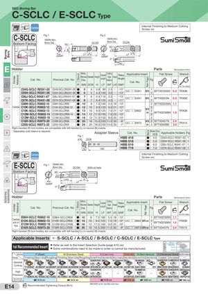 BoringSmal Diameter Turning BarsVery Smal Diameter Turning HolderHolder MaterialMaterial WF WF StockStock WF Ref. Page Ref. PageStock Legend SEC-Boring Bar C-SCLC / E-SCLC Type 95° Carbide Internal Finishing to Medium CuttingScrew-on C-SCLC Fig 1DMIN Min. Fig 2 DMIN Min. Bottom Facing Bore Dia. 95° DCON Bore Dia. DCON 95° GAMF LF H HLFGAMF 0° LHD E Holder Parts Dimensions (mm) Cat. No. Previous Cat. No. Min. Bore Dia. Diameter Height Overall Length Cutting Edge Distance Head Rake Angle Applicable Insert Fig Flat Screw Wrench Cat. No. Nm C R DMIN DCON H LF WF LHD GAMF (For Torx Holes) C04G-SCLC R03X1-05* C04G-SCLCR03X1-05* ● 5C05H-SCLC R03X1-06*C05H-SCLCR03X1-06* ●6453.8904.4 1002.5Q3.0Q-15°-13° CC□□03X1 B74 11 BFTX016033 0.2 TRX06 C06J-SCLC R04X1-07* C06J-SCLCR04X1-07* ● 7C07K-SCLC R04X1-08*C07K-SCLCR04X1-08* ●865.4 1103.5Q-13° CC□□04X1 B74 1 BFTX0203N 0.5 TRX0676.4 1254.0Q-11°1 D C08H-SCLC R0602-10 C08H-SCLCR06 ● 10 8 7.0 100 5.5 19 -13° 2 BFTX02505N 1.1 Carbide C10K-SCLC R0602-12 C10K-SCLCR06-12C10K-SCLC R0602-13C10K-SCLCR06C12M-SCLC R0602-14C12M-SCLCR06-14●12●13●14109.0 1256.0 21-12°109.0 1257.0 21-12°CC□□06021211.0 1507.0 25-10°2B75on22BFTX02506N 1.5 TRX08 R C12M-SCLC R0602-16 C12M-SCLCR06 ● 16 12 11.0 150 9.0 25 -10° 2 C16R-SCLC R09T3-20 C16R-SCLCR09C20S-SCLC R09T3-25C20S-SCLCR09●20●251615.0 200 11.0 302018.0 250 13.0 35-8°-7° CC□□09T3 B78 2 BFTX0407Non2BFTX0409N 3.43.4 TRX15 Right-handed (R) tool holders are compatible with left-handed (L) or neutral (N) inserts. S * Separately sold sleeve is required. Adapter Sleeve Cat. No.Fig 1ø16DCBHBB 416 Bore Dia.DCB Applicable Holders Fig●4.0C04G-SCLC R03X1-051 HBB 516 ● 5.0 C05H-SCLC R03X1-06 1 HBB 616 ● 6.0 C06J-SCLC R04X1-07 1 T 15 100 HBB 716 ● 7.0 C07K-SCLC R04X1-08 1 95° Carbide Internal Finishing to Medium Cutting Coolant Hole Screw-on V E-SCLC Fig 1 DMIN Min.Bore Dia.DCON With oil hole Bottom Facing 95° W LHD HLF GAMF 0° Holder Parts Dimensions (mm) Cat. No. Previous Cat. No. Min. Bore Dia. Diameter Height Overall Length Cutting Edge Distance Head Rake Angle Applicable Insert Fig Flat Screw Wrench Cat. No. Nm R DMIN DCON H LF WF LHD GAMF (For Torx Holes) E08H-SCLC R0602-10 E08H-SCLCR06 ● 10 8 7.5 100 5.5 18 -13° 1 BFTX02505N 1.1 Carbidewith oilholeE10K-SCLC R0602-13E12M-SCLC R0602-16 E10K-SCLCR06E12M-SCLCR06E16R-SCLC R09T3-20E16R-SCLCR09●13●16●2010129.5 12511.5 1507.0 199.0 25-12°-10° CC□□0602 B75 on 11 BFTX02506N 1.5 TRX081615.5 200 11.0 30-8°CC□□09T3 B78 on1BFTX0407N3.4TRX15 Right-handed (R) tool holders are compatible with left-handed (L) or neutral (N) inserts. Applicable Inserts S-SCLC / A-SCLC / B-SCLC / C-SCLC / E-SCLC Type 1st Recommended Insert ● Refer as well to the Insert Selection Guide (page A10 on).● Some combinations need to be made to order or cannot be manufactured. Name ofChipbreaker/GUCBN/PCDPhotoGradeAC8025P Cutting Range P (Steel) M (Stainless Steel) K (Cast Iron) S (Exotic Alloy) N (Non-ferrous) H (Hardened Steel) Hard Brittle Material Process Finishing Medium Cutting Roughing Finishing Medium Cutting Roughing High-speed Finishing FinishingtoMediumCutting Medium to Roughing FinishingtoMediumCutting High-precision/Finishing FinishingtoMediumCutting Coated Uncoated — General FB SU MU LB SU MU SUMIBORON MU No Chipbreaker SU SUMIDIA AG SUMIBORON SUMIBORON SUMIDIA Cutting T1500Z AC8025P AC8025P AC6030M AC6030M AC6040M BN7000/BNC500 AC4015K AC4015K AC5015S DA1000 H1 BNC2020 BN2000 DA90 High FC SI SC FC SI SC SUMIBORONPrecisionT1500A AC1030UAC1030UAC1030UAC1030UAC1030UBN7000/BNC500—SI SUMIDIA SUMIBORON SUMIBORON SUMIDIA Binderless——AC5015S DA1000BNC2010 BN1000NPD10 RecommendedCutting Conditions A10 on A14 on A16 on A18 on A22 on A20 on M2 on E14 N m Recommended Tightening Torque (N·m) BNC500 is for ductile cast iron.