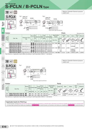 BoringSmal Diameter Turning BarsVery Smal Diameter Turning HolderHolder MaterialMaterial WF WF E1 E1 WF E1 Ref. Page Ref. Page SEC-Boring Bar S-PCLN / B-PCLN Type 95° Steel Medium Diameter General-purposeLever Lock S-PCLN Fig 1 DMIN Min.Bore Dia. DCONBottom Facing Fig 2 DMIN Min.Bore Dia. DCON 95˚ 95° GAMF HLF HLFGAMF -6° -6° E LHD Figure shows right-hand (R) tool. Holder Parts Dimensions (mm) C Cat. No. Previous Cat.No. Stock Min. Bore Dia. Diameter Height Overall Length Cutting Edge Distance Head Offset Rake Angle ApplicableInsert LeverPinFigBoltShim ShimPinWrench R L Cat. No. DMIN DCON H LF WF LHD E1 GAMF (For Hex Socket) S25R-PCLN R/L0903-32 Q ● ● 32 25 23 200 17.0 30 4.5 -15° CN□□0903 B20 1 LCL3 LCS3 LSC32 LSP3 LH025 D S32S-PCLN R/L1204-40 Q ●● 40 32 30 250 22.0 29 7.0 -10° 1 Steel S32S-PCLN R/L1204-44S40T-PCLN R/L1204-50S40T-PCLN R/L1204-54S32S-PCLN R/L 12▲▲44Q●●50S40T-PCLN R/L 12▲▲5432 30 250 22.0 2940 37 300 25.0 2940 37 300 27.0 297.0 -10°6.5 -10°CN□□1204B22on8.5 -10°111LCL4LCS4LSC42BLSP4LSC42LH030 R S50U-PCLN R/L1204-63 Q ● ● 63 50 47 350 31.5 Q 8.0 -10° 2 LSC42BS50U-PCLN R/L1906-70S50U-PCLN R/L 19▲▲70504735035.0 39 11.5 -10°CN□□1906B28 on1LCL6LCS6LSC63LSP6LH040 Feed direction of applicable inserts differs according to machining details. (Refer to * note below) S Steel with95°Anti-VibrationMechanism Medium Diameter General-purposeLever Lock T B-PCLN Fig 1 DMIN Min. Bore Dia.Bottom Facing DCON 95° V HLF -10° -6° LHD W Figure shows right-hand (R) tool. Holder Parts Dimensions (mm) Cat. No. Stock Min. Bore Dia. Diameter Height Overall Length Cutting Edge Distance Head Offset ApplicableInsert Lever PinFig Bolt Shim ShimPin Wrench R L Cat. No. DMIN DCON H LF WF LHD E1 (For Hex Socket) Steel with Anti- B32U-PCLN R/L1204-40 ●Vibration MechanismB40W-PCLNR/L1204-50●405032403037350450202529295.06.5 CN□□1204 B22 on 11 LCL4 LCS4CALCS4LSC42B LSP4 LH030 Feed direction of applicable inserts differs according to machining details. (Refer to * note below) *Applicable Inserts for PCLN Type For internal diameter machining: Right-handed (R) tool holders are compatible with left-handed (L) or neutral (N) inserts. Left-handed (L) tool holders are compatible with right-handed (R) or neutral (N) inserts. For facing: Right-handed (R) tool holders are compatible with right-handed (R) or neutral (N) inserts. Left-handed (L) tool holders are compatible with left-handed (L) or neutral (N) inserts. E18 ▲ mark: To be replaced by a new product, made to order, or discontinued (please confirm stock availability).