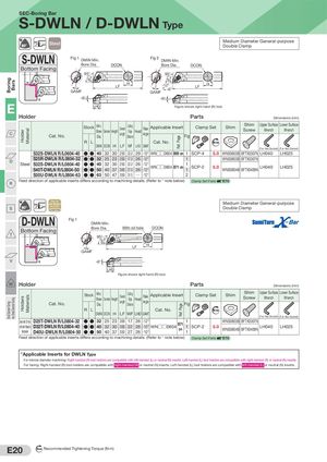 BoringSmal Diameter Turning BarsVery Smal Diameter Turning HolderHolders MaterialMaterials WF WF WF Ref. PageRef. Page SEC-Boring Bar S-DWLN / D-DWLN Type 95° Steel Medium Diameter General-purposeDouble Clamp S-DWLN Fig 1 DMIN Min. Fig 2 DMIN Min. Bore Dia. DCON Bore Dia. DCON Bottom Facing 95° 95° HLF -12° HLF GAMF -6°GAMF -6° -6° E LHD Figure shows right-hand (R) tool. Holder Parts Dimensions (mm) C Cat. No. Stock Min.BoreDia.Diameter HeightOveralLengthCuttingEdgeDistanceHeadRakeAngleApplicable InsertFigClamp SetShim Shim Upper Surface Lower SurfaceScrewWrenchWrench R L Cat. No. Nm DMIN DCON H LF WF LHD GAMF (For Hex Socket) (For Hex Socket) S32S-DWLN R/L0604-40 ● ● 40 32 30 250 22.0 29 -10° WN□□0604 B69 on 1 SCP-4 5.0 WNS0603B BFTX0307N LH040 LH025 D S25R-DWLN R/L0804-32 ● ● 32 25 23 200 17.0 26 -12° 1SteelS32S-DWLN R/L0804-40S40T-DWLN R/L0804-50●●40●●503240303725022.030027.02626-12°-12°WN□□0804 B71 on11SCP-2WNS0803B BFTX0307N5.0WNS0804B BFTX0409N LH040LH025 S50U-DWLN R/L0804-63 ● ● 63 50 47 350 31.5 Q -12° 2 R Feed direction of applicable inserts differs according to machining details. (Refer to * note below) Clamp Set Parts E70 Steel with95°Anti-Vibration Medium Diameter General-purpose S MechanismCoolant Hole Double Clamp D-DWLN Fig 1 DMIN Min. Bottom Facing Bore Dia. With oil hole DCON T 95° LF H GAMF V -6° LHD Figure shows right-hand (R) tool. W Holder Parts Dimensions (mm) Cat. No. Stock Min.Bore Diameter HeightDia.OveralLengthCuttingEdgeHeadDistanceRake Applicable InsertAngleFigClamp SetShim Shim Upper Surface Lower SurfaceScrewWrenchWrench R L Cat. No. Nm DMIN DCON H LF WF LHD GAMF (For Hex Socket) (For Hex Socket) Steel with Oil Holewith Anti-VibrationMechanismD25T-DWLN R/L0804-32D32T-DWLN R/L0804-40D40U-DWLN R/L0804-50●●●●●●32405025324023303730030035017222726 -12°26 -10° WN□□0804 B71 on26 -10°111SCP-2WNS0803B BFTX0307N5.0WNS0804B BFTX0409N LH040LH025 Feed direction of applicable inserts differs according to machining details. (Refer to * note below) Clamp Set Parts E70 *Applicable Inserts for DWLN Type For internal diameter machining: Right-handed (R) tool holders are compatible with left-handed (L) or neutral (N) inserts. Left-handed (L) tool holders are compatible with right-handed (R) or neutral (N) inserts. For facing: Right-handed (R) tool holders are compatible with right-handed (R) or neutral (N) inserts. Left-handed (L) tool holders are compatible with left-handed (L) or neutral (N) inserts. E20 N m Recommended Tightening Torque (N·m)
