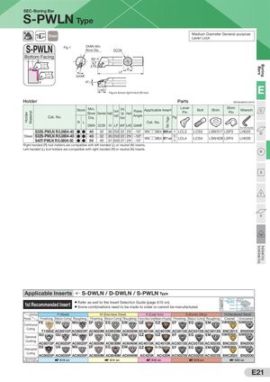 Holder Material WF Ref. Page Legend Very Smal Diameter TurningBars Smal Diameter TurningBoring SEC-Boring Bar S-PWLN Type 95° Steel Medium Diameter General-purposeLever Lock S-PWLN Fig 1 DMIN Min.Bore Dia. DCON Bottom Facing 95° H LF GAMF -6° LHD Figure shows right-hand (R) tool. E Holder Parts Dimensions (mm) Cat. No. Stock Min.BoreDia.Diameter Height Overal Length CuttingEdge Distance HeadRakeAngleApplicable Insert Fig LeverPin Bolt Shim ShimPin Wrench C R L Cat. No. DMIN DCON H LF WF LHD GAMF (For Hex Socket) S32S-PWLN R/L0604-40 ●● 40 32 30 250 22 29 -10° WN□□0604 B69 on 1 LCL3 LCS3 LSW317 LSP3 LH025 D Steel S32S-PWLN R/L0804-40 ●● 40S40T-PWLN R/L0804-50●●50324030 250 222937 300 2729 -10°-10°WN□□0804 B71 on 11 LCL4 LCS4 LSW42B LSP4 LH030 Right-handed (R) tool holders are compatible with left-handed (L) or neutral (N) inserts. Left-handed (L) tool holders are compatible with right-handed (R) or neutral (N) inserts. R S T V W Applicable Inserts S-DWLN / D-DWLN / S-PWLN Type 1st Recommended Insert ● Refer as well to the Insert Selection Guide (page A10 on).● Some combinations need to be made to order or cannot be manufactured. Name ofChipbreaker/GUCBN/PCDPhotoGradeAC8025P Cutting Range P (Steel) M (Stainless Steel) K (Cast Iron) S (Exotic Alloy) H (Hardened Steel) Process Finishing Medium Cutting Roughing Finishing Medium Cutting Roughing Finishing to Medium Cutting Medium to Roughing Finishing Medium Cutting Roughing Coated Uncoated Continuous FE GU MU EF EG EM UZ GZ EF EG EM SUMIBORON SUMIBORON Cutting T1500Z AC8015P AC8025P AC6020M AC6020M AC6030M AC4010K AC4010K AC5015S AC5015S AC5015S BNC2010 BN2000 General SU GU MU EF EG EM GZ GZ EF EG EM SUMIBORON SUMIBORON Cutting AC8015P AC8025P AC8025P AC6030M AC6030M AC6040M AC4015K AC4015K AC5015S AC5015S AC5025S BNC2020 BN2000 Interrupted SX UX MX EF EG EM GZ No Chipbreaker EF EG EM SUMIBORON SUMIBORON Cutting AC8025P AC8035P AC8035P AC6030M AC6040M AC6040M AC420K AC420K AC5025S AC5025S AC5025S BNC2020 BN2000 RecommendedCutting Conditions A10 on A14 on A16 on A18 on A20 on E21
