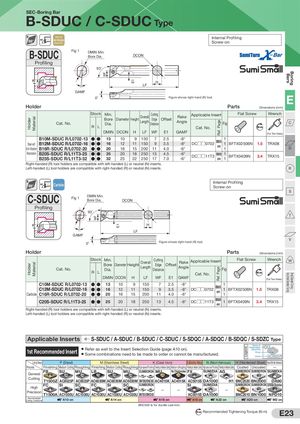 HolderHolder MaterialMaterial WF WF E1 E1 Ref. PageRef. Page Legend Very Smal Diameter TurningBars Smal Diameter TurningBoring SEC-Boring Bar B-SDUC / C-SDUC Type Steel with Internal Profiling 93˚ Anti-VibrationMechanism Screw-on B-SDUC Fig 1 DMIN Min.Bore Dia. DCON Profiling 93˚ H LF GAMF 0° Figure shows right-hand (R) tool. E Holder Parts Dimensions (mm) Cat. No. Stock Min.BoreDia.DiameterHeightOverall Length Cutting Edge Distance Offset Rake Applicable InsertAngle FigRLCat. No. Flat Screw Wrench CNm DMIN DCON H LF WF E1 GAMF (For Torx Holes) B10M-SDUC R/L0702-13 ●● 13 10 9 150 7 2.5Steel withB12M-SDUC R/L0702-16●●16121115093.5Anti-VibrationB16R-SDUCR/L0702-20●●201615200114.0-8°1-8°-6°DC□□0702B85on11BFTX02506N1.5TRX08 D Mechanism B20S-SDUC R/L11T3-25 ●● 25 20 18 250 13 4.5B25S-SDUC R/L11T3-32●●322522250177.0-6°-6°DC□□11T3B88on11BFTX0409N 3.4 TRX15 Right-handed (R) tool holders are compatible with left-handed (L) or neutral (N) inserts. Left-handed (L) tool holders are compatible with right-handed (R) or neutral (N) inserts. R 93˚ Carbide Internal ProfilingScrew-on S C-SDUC Fig 1 DMIN Min.Bore Dia. DCON Profiling 93˚ T H LF GAMF V 0° Figure shows right-hand (R) tool. Holder Parts Dimensions (mm) Cat. No. Stock Min.BoreDia.Diameter HeightOverallLengthCuttingEdgeDistance Offset RakeAngleApplicable Insert Fig Flat Screw Wrench W R L Cat. No. Nm DMIN DCON H LF WF E1 GAMF (For Torx Holes) C10M-SDUC R/L0702-13 ●● 13C12M-SDUC R/L0702-16●●16CarbideC16R-SDUC R/L0702-20●●201012169111515015020079112.53.54.0-8°-8°-6°DC□□0702B85on111 BFTX02506N 1.5 TRX08 C20S-SDUC R/L11T3-25 ●● 25 20 18 250 13 4.5 -6° DC□□11T3 B88on 1 BFTX0409N 3.4 TRX15 Right-handed (R) tool holders are compatible with left-handed (L) or neutral (N) inserts. Left-handed (L) tool holders are compatible with right-handed (R) or neutral (N) inserts. Applicable Inserts S-SDUC / A-SDUC / B-SDUC / C-SDUC / S-SDQC / A-SDQC / B-SDQC / S-SDZC Type 1st Recommended Insert ● Refer as well to the Insert Selection Guide (page A10 on).● Some combinations need to be made to order or cannot be manufactured. Name ofChipbreaker/GUCBN/PCDPhotoGradeAC8025P Cutting Range P (Steel) M (Stainless Steel) K (Cast Iron) S (Exotic Alloy) N (Non-ferrous) H (Hardened Steel) Hard Brittle Material Process Finishing Medium Cutting Roughing Finishing Medium Cutting Roughing High-speed Finishing FinishingtoMediumCutting Medium to Roughing FinishingtoMediumCutting High-precision/Finishing FinishingtoMediumCutting Coated Uncoated — General FB SU MU LB SU MU SUMIBORON MU No Chipbreaker FX SUMIDIA AG SUMIBORON SUMIBORON SUMIDIA Cutting T1500Z AC8025P AC8025P AC6030M AC6030M AC6030M BN7000/BNC500 AC4015K AC4015K AC5015S DA1000 H1 BNC2020 BN2000 DA90 High FC SI SC FC SI SC SUMIBORONPrecisionT1500AAC1030UAC1030UAC1030UAC1030UAC1030UBN7000/BNC500—SISUMIDIA SUMIBORON SUMIBORON SUMIDIA Binderless——AC5015S DA1000BNC2010 BN1000NPD10 RecommendedCutting Conditions A10 on A14 on A16 on A18 on A22 on A20 on M2 on BNC500 is for ductile cast iron. N m Recommended Tightening Torque (N·m) E23