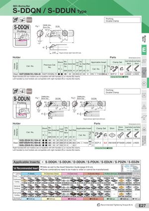 HolderHolder MaterialMaterial WFWF E1 E1 WF Ref. Page E1 Ref. Page Legend Very Smal Diameter TurningBars Smal Diameter TurningBoring SEC-Boring Bar S-DDQN / S-DDUN Type 107.5° Steel ProfilingDouble Clamp S-DDQN Fig 1 DMIN Min.Bore Dia.DCON Profiling 107.5° H LF -12° -6° E LHD Figure shows right-hand (R) tool. Holder Parts Dimensions (mm) Cat. No. Previous Cat.No. Stock Min. Bore Dia. Diameter Height Overal Length Cutting Edge Distance Head Offset Applicable Insert Fig Clamp Set Upper Surface Lower SurfaceWrenchWrench C R L Cat. No. Nm DMIN DCON H LF WF LHD E1 (For Hex Socket) (For Hex Socket) Steel S32T-DDQN R/L1504-40 S32T-DDQNL15 ●● 40 32 30 300 22 48 6 DN□□1504 B32 on 1 SCP-2 5.0 LH040 LH025 D Right-handed (R) tool holders are compatible with left-handed (L) or neutral (N) inserts. Clamp Set Parts E70 Left-handed (L) tool holders are compatible with right-handed (R) or neutral (N) inserts. R 93˚ Steel ProfilingDouble Clamp S S-DDUN Fig 1 DMIN Min.Bore Dia.DCON Fig 2 DMIN Min.Bore Dia. DCON Profiling 93° 93° H H T LF LF -12° -12° -6° -6° LHD Figure shows right-hand (R) tool. V Holder Parts Dimensions (mm) Cat. No. Stock Min. Bore Dia. Diameter Height Overall Length Cutting Edge Distance Head Applicable Insert Offset Fig Clamp Set Shim Shim Upper Surface Lower SurfaceScrewWrenchWrenchW R L Cat. No. Nm DMIN DCON H LF WF LHD E1 (For Hex Socket) (For Hex Socket) S32S-DDUN R/L1504-40 ●● 40SteelS40T-DDUN R/L1504-50●●50S50U-DDUN R/L1504-63●●633240503025022.03730027.04735031.52626Q7.08.58.0DN□□1504 B32 on112SCP-25.0DNS1504B BFTX0409N LH040 LH025 Right-handed (R) tool holders are compatible with left-handed (L) or neutral (N) inserts. Clamp Set Parts E70 Left-handed (L) tool holders are compatible with right-handed (R) or neutral (N) inserts. Applicable Inserts S-DDQN / S-DDUN / D-DDUN / S-PDUN / S-EDUN / S-PDZN / S-EDZN 1st Recommended Insert ● Refer as well to the Insert Selection Guide (page A10 on).● Some combinations need to be made to order or cannot be manufactured. Name ofChipbreaker/GUCBN/PCDPhotoGradeAC8025P Cutting Range P (Steel) M (Stainless Steel) K (Cast Iron) S (Exotic Alloy) N (Non-ferrous) H (Hardened Steel) Hard Brittle Material Process Finishing Medium Cutting Roughing Finishing Medium Cutting Roughing High-speed Finishing FinishingtoMediumCuting Medium to Roughing Finishing Medium Cutting Roughing High-precision/Finishing FinishingtoMediumCuting Coated Uncoated Finishing Continuous FE GU MU EF EG EM SUMIBORON UZ GZ EF EG EM SUMIDIA AX SUMIBORON SUMIBORON SUMIDIA Binderless Cutting T1500Z AC8015P AC8025P AC6020M AC6020M AC6030M BN7000/BNC500 AC4010K AC4010K AC5015S AC5015S AC5015S DA1000 H1 BNC2010 BN1000 NPD10 General SU GU MU EF EG EM SUMIBORON GZ GZ EF EG EM SUMIDIA AX SUMIBORON SUMIBORON SUMIDIA Cutting AC8015P AC8025P AC8025P AC6030M AC6030M AC6040M BN7000/BNC500 AC4015K AC4015K AC5015S AC5015S AC5025S DA1000 H1 BNC2020 BN2000 DA90 Interrupted SX UX MX EF EG EM SUMIBORON GZ No Chipbreaker EF EG EM SUMIDIACuttingAC8025P AC8035P AC8035P AC6030M AC6040M AC6040M BN7000/BNC500 AC420K AC420K AC5025S AC5025S AC5025S DA1000—SUMIBORON SUMIBORONBNC300 BN350— RecommendedCutting Conditions A10 on A14 on A16 on A18 on A22 on A20 on M2 on N m Recommended Tightening Torque (N·m) E27