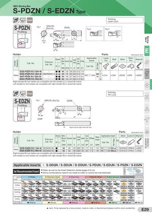 HolderHolder MaterialMaterial WF WF E1 E1 Ref. Page Ref. Page Legend Very Smal Diameter TurningBars Smal Diameter TurningBoring SEC-Boring Bar S-PDZN / S-EDZN Type 93° Steel ProfilingLever Lock S-PDZN Fig 1 DMIN Min.Bore Dia. DCON Fig 2 Fig 3 Profiling -6° 93°26 LF H -5° -12° -6° 25 E Holder Parts Dimensions (mm) Cat. No. PreviousCat. No.Stock Min.BoreDia.DiameterHeight Overall LengthCuttingEdgeDistanceOffset ApplicableInsert LeverPinFigBolt Shim ShimPin Wrench C R L Cat. No. DMIN DCON H LF WF E1 (For Hex Socket) S32S-PDZN R/L1504-40 Q ●● 40 32 30 250 22.0 7.0 2 Steel S32S-PDZN R/L1504-44S40T-PDZN R/L1504-50S32S-PDZN R/L 15 ▲ ▲44Q●●50324030 250 22.037 300 27.0 7.08.5 DN□□1504 B32on 12 LCL4 LCS4 LSD42 LSP4 LH030 D S50U-PDZN R/L1504-63 Q ●● 63 50 47 350 31.5 8.0 3 Right-handed (R) tool holders are compatible with left-handed (L) or neutral (N) inserts. Left-handed (L) tool holders are compatible with right-handed (R) or neutral (N) inserts. R 93° Steel ProfilingPin Lock S S-EDZN Fig 1 DMIN Min. Bore Dia. DCON Profiling T 93˚ H LHD LF GAMF V -5° Figure shows right-hand (R) tool. Holder Parts Dimensions (mm) W Cat. No. PreviousCat. No.Stock Min.BoreDia.DiameterHeight Overall Length Head Cutting Edge Distance Offset RakeAngle Applicable Insert Fig Shim Eccentric Pin WrenchRLCat. No. DMIN DCON H LF LHD WF E1 GAMF (For Hex Socket) Steel S25R-EDZN R/L1104-34S32S-EDZN R/L1504-44BDZN325 R/LBDZN432 R/L●●3425 23 200 20 17 5.5 -12° DN□□1104 B31 on 1 SDW323 CPB34 LH02544323025025227.0-10°DN□□1504B32 on1SDW423 CPB43LH030 Right-handed (R) tool holders are compatible with left-handed (L) or neutral (N) inserts. Left-handed (L) tool holders are compatible with right-handed (R) or neutral (N) inserts. Applicable Inserts S-DDQN / S-DDUN / D-DDUN / S-PDUN / S-EDUN / S-PDZN / S-EDZN 1st Recommended Insert ● Refer as well to the Insert Selection Guide (page A10 on).● Some combinations need to be made to order or cannot be manufactured. Name ofChipbreaker/GUCBN/PCDPhotoGradeAC8025P Cutting Range P (Steel) M (Stainless Steel) K (Cast Iron) S (Exotic Alloy) N (Non-ferrous) H (Hardened Steel) Hard Brittle Material Process Finishing Medium Cutting Roughing Finishing Medium Cutting Roughing High-speed Finishing FinishingtoMediumCuting Medium to Roughing Finishing Medium Cutting Roughing High-precision/Finishing FinishingtoMediumCuting Coated Uncoated Finishing Continuous FE GU MU EF EG EM SUMIBORON UZ GZ EF EG EM SUMIDIA AX SUMIBORON SUMIBORON SUMIDIA Binderless Cutting T1500Z AC8015P AC8025P AC6020M AC6020M AC6030M BN7000/BNC500 AC4010K AC4010K AC5015S AC5015S AC5015S DA1000 H1 BNC2010 BN1000 NPD10 General SU GU MU EF EG EM SUMIBORON GZ GZ EF EG EM SUMIDIA AX SUMIBORON SUMIBORON SUMIDIA Cutting AC8015P AC8025P AC8025P AC6030M AC6030M AC6040M BN7000/BNC500 AC4015K AC4015K AC5015S AC5015S AC5025S DA1000 H1 BNC2020 BN2000 DA90 Interrupted SX UX MX EF EG EM SUMIBORON GZ No Chipbreaker EF EG EM SUMIDIACuttingAC8025PAC8035PAC8035PAC6030MAC6040MAC6040MBN7000/BNC500AC420KAC420KAC5025SAC5025SAC5025SDA1000—SUMIBORON SUMIBORONBNC300 BN350— RecommendedCutting Conditions A10 on A14 on A16 on A18 on A22 on A20 on M2 on ▲ mark: To be replaced by a new product, made to order, or discontinued (please confirm stock availability). E29