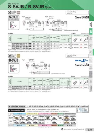 HolderHolder MaterialMaterial WF WF WF Ref. PageRef. Page Legend Very Smal Diameter TurningBars Smal Diameter TurningBoring SEC-Boring Bar S-SVJB / B-SVJB Type Steel93° Internal ProfilingScrew-on S-SVJB Fig 1 DMIN Min.Bore Dia. Fig 2 DMIN Min.Bore Dia. Concave Facing and Bottom Facing DCON52° 52° DCON 93° 93° -5° LH3 HLHDLF GAMF LH3LHD HLF -5° -5° Figure shows right-hand (R) tool. E Holder Parts Dimensions (mm) Cat. No. Stock Min.BoreDia.DiameterHeightOverallLengthCuttingEdgeDistanceHeadHeadRakeAngleApplicable Insert Fig Flat Screw Wrench C R L Cat. No. Nm DMIN DCON H LF WF LHD LH3 GAMF (For Torx Holes) S20R-SVJB R/L1103-25 ●● 25SteelS25S-SVJB R/L1103-30S32T-SVJB R/L1604-40●●●●3040S40T-SVJB R/L1604-50●●502025192002.04229242503.55036QQVB□□1103 B120 11 BFTX02508NV 1.5 TRX083240303003.575373004.5956075-8°-7°VB□□1604B12122BFTX035082.0TRX10D Right-handed (R) tool holders are compatible with left-handed (L) or neutral (N) inserts. Left-handed (L) tool holders are compatible with right-handed (R) or neutral (N) inserts. R Steel with Internal Profiling Anti-Vibration93°Mechanism Screw-on B-SVJB Fig 1 DMIN Min.Bore Dia. S DCON Concave Facing and Bottom Facing 52° 93° -5° LH3LHD HLF T -5° Figure shows right-hand (R) tool. V Holder Parts Dimensions (mm) Cat. No. Stock Min.BoreDia.Diameter Height OverallLengthCuttingEdgeDistanceHeadHeadApplicable Insert Fig Flat Screw Wrench W R L Cat. No. Nm DMIN DCON H LF WF LHD LH3 (For Torx Holes) Steel with B20R-SVJB R/L1103-25 ●● 25Anti-VibrationMechanismB25S-SVJB R/L1103-30●●302025192002.0242503.5556237.545VB□□1103 B120 11 BFTX02508NV 1.5 TRX08 Right-handed (R) tool holders are compatible with left-handed (L) or neutral (N) inserts. Left-handed (L) tool holders are compatible with right-handed (R) or neutral (N) inserts. Applicable Inserts S-SVJB / B-SVJB / S-SVQB / B-SVQB / C-SVQB / S-SVUB / B-SVUB / C-SVUB / S-SVZB / B-SVZB / C-SVZB Type 1st Recommended Insert ● Refer as well to the Insert Selection Guide (page A10 on).● Some combinations need to be made to order or cannot be manufactured. Name ofChipbreaker/GUCBN/PCDPhotoGradeAC8025P Cutting Range P (Steel) M (Stainless Steel) K (Cast Iron) S (Exotic Alloy) N (Non-ferrous) H (Hardened Steel) Process Finishing Medium Cutting Finishing Medium Cutting High-speed Finishing Finishing to Medium Cutting Finishing to Medium Cutting Finishing to Medium Cutting Coated Uncoated General FB SU LB SU SUMIBORON No Chipbreaker SI AY SUMIBORON SUMIBORON Cutting T1500Z AC8025P AC6030M AC8025P BN7000/BNC500 AC4015K AC5015S H1 BNC2020 BN2000 High FYS SI FYS SI SUMIBORONPrecisionAC1030UAC1030UAC1030UAC1030U BN7000/BNC500—SIAC5015S— SUMIBORON SUMIBORONBNC2010BN1000 RecommendedCutting Conditions A10 on A14 on A16 on A18 on A22 on A20 on BNC500 is for ductile cast iron. N m Recommended Tightening Torque (N·m) E31