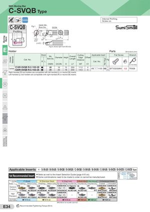 BoringSmal Diameter Turning BarsVery Smal Diameter Turning Holder Material WF E1 Ref. Page Legend SEC-Boring Bar C-SVQB Type 108° Carbide Internal ProfilingScrew-on C-SVQB Fig 1 DMIN Min.Bore Dia. DCON Profiling 108° H 35° LF -6.5° (-4.5°) Figure shows right-hand (R) tool. E Holder Parts Dimensions (mm) Cat. No. Stock Min.Bore Dia.DiameterHeight OverallLength CuttingEdgeOffsetDistance Applicable Insert Fig Flat Screw Wrench C R L Cat. No. Nm DMIN DCON H LF WF E1 (For Torx Holes) Carbide C16R-SVQB R/L1103-20C20R-SVQB R/L1103-25 ●● 2025 1620 15 200 11.51820014.5 45 VB□□1103 B120 11 BFTX02508NV 1.5 TRX08 Right-handed (R) tool holders are compatible with left-handed (L) or neutral (N) inserts. D Left-handed (L) tool holders are compatible with right-handed (R) or neutral (N) inserts. R S T V W Applicable Inserts S-SVJB / B-SVJB / S-SVQB / B-SVQB / C-SVQB / S-SVUB / B-SVUB / C-SVUB / S-SVZB / B-SVZB / C-SVZB Type 1st Recommended Insert ● Refer as well to the Insert Selection Guide (page A10 on).● Some combinations need to be made to order or cannot be manufactured. Name ofChipbreaker/GUCBN/PCDPhotoGradeAC8025P Cutting Range P (Steel) M (Stainless Steel) K (Cast Iron) S (Exotic Alloy) N (Non-ferrous) H (Hardened Steel) Process Finishing Medium Cutting Finishing Medium Cutting High-speed Finishing Finishing to Medium Cutting Finishing to Medium Cutting Finishing to Medium Cutting Coated Uncoated General FB SU LB SU SUMIBORON No Chipbreaker SI AY SUMIBORON SUMIBORON Cutting T1500Z AC8025P AC6030M AC8025P BN7000/BNC500 AC4015K AC5015S H1 BNC2020 BN2000 High FYS SI FYS SI SUMIBORONPrecisionAC1030UAC1030UAC1030UAC1030U BN7000/BNC500—SIAC5015S — SUMIBORON SUMIBORONBNC2010BN1000 RecommendedCutting ConditionsA10 on A14 on A16 on A18 on A22 on A20 on BNC500 is for ductile cast iron. E34 N m Recommended Tightening Torque (N·m)