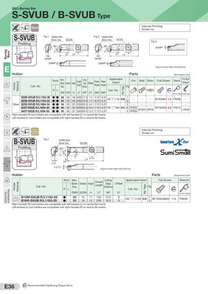 BoringSmal Diameter Turning BarsVery Smal Diameter Turning HolderHolder MaterialMaterial WF WF E1 E1 WF E1 Ref. Page Ref. Page SEC-Boring Bar S-SVUB / B-SVUB Type 93˚ Steel Internal ProfilingScrew-on S-SVUB Fig 1 DMIN Min.Bore Dia.DCON Fig 2 DMIN Min.Bore Dia.DCON Fig 3 Profiling 93° 93° GAMP HLF LF H GAMF GAMF GAMP GAMP E Figure shows right-hand (R) tool. Holder Parts Dimensions (mm) C Cat. No. Stock Min.BoreDia.DiameterHeightOverallLengthCuttingEdgeDistanceOffsetRakeAngleRakeAngleApplicableInsertPinFigBolt Shim Flat Screw Wrench For BoltWrench R L Cat. No. Nm DMIN DCON H LF WF E1 GAMF GAMP (For Torx Holes) (For Hex Socket) D S20R-SVUB R/L1103-28S25S-SVUB R/L1103-32●● 28●●322025 1823 200 17.5250 19.0 7.57.5-7.5° -6.5° -3.0° -2.5° VB□□1103 B120 12 QSteelS25S-SVUB R/L1604-34●●342523250 20.59.0-7.5° -3.0°2QQQQBFTX02508NV1.5TRX08QQQ S32T-SVUB R/L1604-40S40T-SVUB R/L1604-50●● 40●●503240 3037 300 23.5 10.5 -7.5° -3.0° VB□□1604 B121300 29.5 12.5 -7.5° -3.0° 33 VP32BVP40BBH03504 SVP32 BFTX03508 2.0 TRX10 LH020 Right-handed (R) tool holders are compatible with left-handed (L) or neutral (N) inserts. R Left-handed (L) tool holders are compatible with right-handed (R) or neutral (N) inserts. Steel with Internal Profiling S 93˚ Anti-VibrationMechanism Screw-on B-SVUB Fig 1 DMIN Min.Bore Dia. DCON ProfilingT 93° H LF 35° -7.5° V (-2.5°) Figure shows right-hand (R) tool. Holder Parts Dimensions (mm) W Cat. No. Stock Min.BoreDia.Diameter Height OverallLengthCuttingEdgeDistanceOffset Applicable Insert Fig Flat Screw Wrench R L Cat. No. Nm DMIN DCON H LF WF E1 (For Torx Holes) Steel with B12M-SVUB R/L1103-20 ●Anti-VibrationMechanismB16R-SVUB R/L1103-25●20121115013.525161520016.589 VB□□1103 B120 11 BFTX02508NV 1.5 TRX08 Right-handed (R) tool holders are compatible with left-handed (L) or neutral (N) inserts. Left-handed (L) tool holders are compatible with right-handed (R) or neutral (N) inserts. E36 N m Recommended Tightening Torque (N·m)