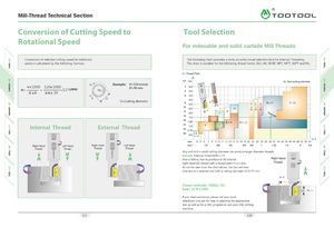 Mill-Thread Technical Section A\ (B>VX Conversion of Cutting Speed to Tool Selection Rotational Speed For indexable and solid carbide Mill Threads Conversion of selected cutting speed to rotational The following chart provides a fairly accurate visual selection tool for Internal Threading. speed is calculated by the following formula: The chart is suitable for the following thread forms: ISO, UN, WHIT, NPT, NPTF, BSPT and PG. P= Thread Pitch A TPI mm D= Tool cutting diameter Example: V=120 m/min VxlOOO 120x 1000N==1274FIPMJtxD3.14 x 30 D-30 mm 4 6.055.0 6 4.0 D=Cutting diameter 3.5 —83.0 — r '% oo D= 21 D= 29 10 2.5 10 iio Q Q 12 2.0 0 87161.5201.25241.0 —320.75y-4 I ft D=9D = 12 r 48 0.5 3 d mm 4 5 6 7 8 9 10 11 12 1314 15 16 18 20 22 24 26 28 30 32 34 36 38 40 44 48 52 58 64 inch 1/4 3/8 1/2 5/8 3/4 1 1.25 1.5 2 2.5 Any tool with a small cutting diameter can produce larger diameter threads. Example: Internal thread M30 x 1.5: Find a Milling Tool to produce d=30 Internal Right Hand right hand ISO thread with a thread pitch P=1.5 mm. Thread As can be seen from the chart above, the two red linesintersect at a selected tool with a cutting diameter of D=21 mm i d= 30 Chosen toolholder: SR0021 H21 Insert: 21 N 1.5 ISO If you need assistance, please call your local distributor and ask for help in selecting the appropriate tool as well as for a CNC program to suit your CNC milling machine. 337 338