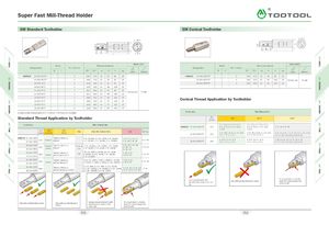 Super Fast Mill-Thread Holder .A\V/ SM Standard Toolholder SM Conical Toolholder T D1 CZD"ap J —T' /TV * D2 L Spare parts Spare parts Stock Dimensions(mm) Stock Dimensions(mm) Designation No. of Inserts Designation No. of Inserts R L D1 D2 d LI L ap screw Wrench R L D1 D2 d LI L ap screw Wrench HSMC25 17- A25 -26T2(1) 2 14.0 17.0 25 26 85 25 HSMC25 17-A25-26T2-PT 2 14.0 17.2 25 26 85 25 17- A25 -36T2(1) 2 14.0 17.0 25 36 95 25 22-A25-43T3-PT 3 18.0 22.2 25 43 102 25 SSTM 4- 3.6P TT-08P 19-A25-32T2 2 15.0 19.0 25 32 92 25 28-A25-43T4-PT 3 25.0 28.4 25 43 103 25 19- A 25 -44T2 2 15.0 19.0 25 44 104 25 21- A25 -37T3 3 16.5 20.5 25 37 96 25 SSTM4-3.6P TT-08P 21- A25 -44T3 3 16.5 20.5 25 44 103 25 22 - A25 -43T3 3 18.0 22.0 25 43 102 25 Conical Thread Application by Toolholder 22 - A25 - 55T3 3 18.0 22.0 25 55 114 25 30- A25 - 55T5 5 26.0 30.0 25 55 115 25 30- A25 -80T4 4 26.0 30.0 25 80 140 25 (1) Inserts with a thread pitch of > 3 mm or > 8TPI are not moutable Tooholder Min.Thread Dia. Standard Thread Application by Toolholder D2(mm) NPT NPTF BSPT Tooholder Min.Thread Dia. 1/ 2 -14; 3 / 4 -14;1-11.5; 1/ 2 -14; 3 /4 -14;1-11.5; HSMC25 17 -A 25 - 26T2 - PT 17.2 11/ 4 -11.5; 11/ 2 -11.5; 11/4 -11.5;11/ 2 -11.5; 1/ 2 -14; 3 / 4 -14 D2 ISO ISO(mm)(coarse)(fine)UNC UN/UNF/UNEF/UNS BSF BSP(G) 2-11.5 2-11.522 -A 25-43T3 - PT22.23 / 4 -14;1-11.5;11/ 4 -11.5;3 / 4 -14;1-11.5;11/4 -11.5; 3 /4 -14;1-11;11/ 4 -11; 11/ 2 -11; 2-11;11/ 2 -11.5; 2-11.511/ 2 -11.5; 2-11.52 1/ 2 -11; 3-11; 4-11; 5-11; 6-11 HSMC25 17- A 25 - 26T2 "M19xl; M19x1.5;17.017- A 25 - 36T2M20X2.5M20x2"7 / 8 -10UNS; 13 /16 -12UN; 7 / 8 -14UNF;3 /4 -16UNF; 3 /4 -18UNS; 3 /4 -20UNEF"7 / 8 -11; 7 / 8 -12;7 / 8 -14; 7 / 8 -16" 1/ 2 -14 1-11.5; 11/ 4 -11.5; 1-11.5;11/4 -11.5; 1-11; 11/ 4 -11;11/ 2 -11; 2-11;28 -A 25-43T4- PT28.411/ 2 -11.5; 2-11.511/ 2 -11.5; 2-11.52 1/ 2 -11; 3-11; 4-11; 5-11; 6-11 19-A25-32T2 19.019-A25-44T2M22x2.5"M21xl; M21xl.5;M24x3M22x2""7 / 8-9;"7 / 8-20UNEF; 7/ 8 -18UNS; 7 / 8 -16UN;1-8"7 / 8 -14UNF; 7 / 8 -12UN; 7 / 8 -10UNS""7 / 8 -16; 7 / 8 -14;15 /16 -12; 5 / 8 -1415 /16 -11" 21- A 25- 37T3 "M22xl; M23X1.5;20.521- A 25 -44T3M24x3M23x2; M23.5x2.5""15 /16 -9UN; 1-10UNS; 15 /16 -12UN;1-81-14UNS; 15 / 16 -16UN; 7 / 8 -18UNS;"1-11; 1-12;1-14; 1-16"7 / 8 -20UNEF" 5 / 8 -14 22 - A 25 -43 T3 22.022- A 25 - 55T3"M24xl; M24X1.5;M27x3M25x2; M25x2.5""111/16 -8UN;1-9UN;1-10UNS; 1-12UNF; "1-11; 1-12;1-14UNS;1-16UN;1-18UN; 15 /16 -20UNEF"1-14; 1-16" 3 /4 -14 30- A 25 - 55 T 5 30.030- A 25 -80T4"M32xl; M32X1.5;M33x2; M33x2.5; M34x3"13 15 15 / 8 -811N;13 / 8 -9UN;13 / 8 -10UN; /16 -12UN;13 / 8 -14UNS; 15 /16 -16UN; /16 -18UNEF; 15 /16 -20UN "13 / 8 -11; 13 / 8 -12; 13 / 8 -14;13 / 8 -16" 1-11 To mount insert correctly, push the insert toward the \ pocket walls. ' \ Side with identification marks Side without identificationmarks. Always mount all inserts withidentification marks on thesame side. To mount insert correctly,push the insert toward thepocket walls. 351 352