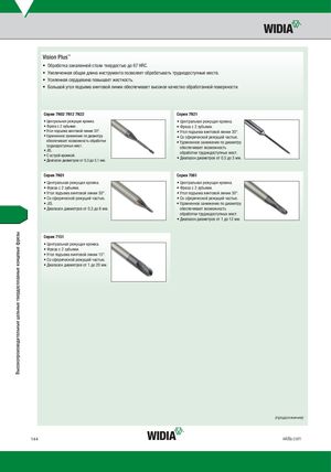 Высокопроизводительные цельные твердосплавные концевые фрезы Vision Plus™ • Обработка закаленной стали твердостью до 67 HRC. • Увеличенная общая длина инструмента позволяет обрабатывать труднодоступные места. • Усиленная сердцевина повышает жесткость. • Большой угол подъема винтовой линии обеспечивает высокое качество обработанной поверхности. Серии 7N02 7N12 7N22 Серия 7N21 • Центральная режущая кромка. • Центральная режущая кромка. • Фреза с 2 зубьями. • Фреза с 2 зубьями. • Угол подъема винтовой линии 30°. • Угол подъема винтовой линии 30°. • Удлиненное занижение по диаметру • Со сферической режущей частью. обеспечивает возможность обработки • Удлиненное занижение по диаметру труднодоступных мест. обеспечивает возможность • JIS.• С острой кромкой.• Диапазон диаметров от 0,3 до 3,1 мм. обработки труднодоступных мест.• Диапазон диаметров от 0,5 до 3 мм. Серия 7N01 Серия 7061 • Центральная режущая кромка. • Центральная режущая кромка. • Фреза с 2 зубьями. • Фреза с 2 зубьями. • Угол подъема винтовой линии 30°. • Угол подъема винтовой линии 30°. • Со сферической режущей частью. • Со сферической режущей частью. • JIS. • Удлиненное занижение по диаметру • Диапазон диаметров от 0,3 до 6 мм. обеспечивает возможность обработки труднодоступных мест. • Диапазон диаметров от 1 до 12 мм. Серия 7151 • Центральная режущая кромка. • Фреза с 2 зубьями. • Угол подъема винтовой линии 15°. • Со сферической режущей частью. • Диапазон диаметров от 1 до 20 мм. (продолжение) 144 widia.com