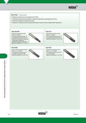 Высокопроизводительные цельные твердосплавные концевые фрезы Vision Plus™ (продолжение) • Обработка закаленной стали твердостью до 67 HRC. • Увеличенная общая длина инструмента позволяет обрабатывать труднодоступные места. • Усиленная сердцевина повышает жесткость. • Большой угол подъема винтовой линии обеспечивает высокое качество обработанной поверхности. Серии 7050 7060 Серия 7150 • Центральная режущая кромка. • Центральная режущая кромка. • Фреза с 4 зубьями. • Фреза с 4 зубьями. • Угол подъема винтовой линии 15°. • Угол подъема винтовой линии 15°. • Со сферической режущей частью. • Со сферической режущей частью. • Удлиненное занижение по диаметру • Диапазон диаметров от 2 до 20 мм. обеспечивает возможность обработки труднодоступных мест. • Диапазон диаметров от 2 до 20 мм. Серия 422831 Серия D618 • Без центральной режущей кромки. • Центральная режущая кромка. • Фрезы с 6 и 8 зубьями. • Фрезы с 4 и 6 зубьями. • Угол подъема винтовой линии 45°. • Угол подъема винтовой линии 50°. • С радиусом при вершине зуба. • С острой кромкой. • Диапазон диаметров от 6 до 25 мм. • Диапазон диаметров от 3 до 20 мм. 146 widia.com