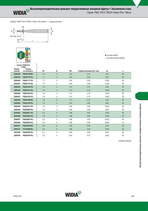 Высокопроизводительные цельные твердосплавные концевые фрезы • Закаленная сталь Серия 7N02 7N12 7N22• Vision Plus™ Micro (Серии 7N02 7N12 7N22 • Vision Plus Micro — продолжение) L3 лучший выбор альтернативный выбор СплTаiвAlTNi-ARlNJ1-RJ1 TiAlN Номер Номер заказа по каталогу D1 D D3 Глубина резания Ap1 max L3 L 2256399 7N0201602RJ 1,6 6 1,54 2,40 4,00 50 2256479 7N2201701RJ 1,7 4 1,64 2,60 6,00 50 2256480 7N2201711RJ 1,7 4 1,64 2,60 10,00 50 2256481 7N2201721RJ 1,7 4 1,64 2,60 12,00 50 2256484 7N2201801RJ 1,8 4 1,74 2,70 6,00 50 2256485 7N2201811RJ 1,8 4 1,74 2,70 10,00 50 2256486 7N2201821RJ 1,8 4 1,74 2,70 12,00 50 2256487 7N2201831RJ 1,8 4 1,74 2,70 16,00 50 2256400 7N0201802RJ 1,8 6 1,74 2,70 4,50 50 2256489 7N2201901RJ 1,9 4 1,84 2,80 6,00 50 2256490 7N2201911RJ 1,9 4 1,84 2,80 10,00 50 2256494 7N2202001RJ 2,0 4 1,96 3,00 6,00 50 2256495 7N2202011RJ 2,0 4 1,96 3,00 10,00 50 2256496 7N2202021RJ 2,0 4 1,96 3,00 16,00 50 2256497 7N2202031RJ 2,0 4 1,96 3,00 20,00 63 2256498 7N2202041RJ 2,0 4 1,96 3,00 20,00 75 2256401 7N0202002RJ 2,0 6 1,96 3,00 5,00 50 2256412 7N1202002RJ 2,0 6 1,96 3,00 10,00 60 3454429 7N2202051RJ 2,1 4 2,00 3,00 8,00 50 2256499 7N2202501RJ 2,5 4 2,40 3,70 8,00 50 (продолжение) widia.com 149 Высокопроизводительные цельные твердосплавные концевые фрезы