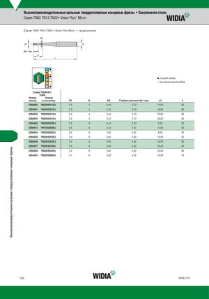 Высокопроизводительные цельные твердосплавные концевые фрезы • Закаленная сталь Серия 7N02 7N12 7N22• Vision Plus™ Micro (Серии 7N02 7N12 7N22 • Vision Plus Micro — продолжение) L3 лучший выбор альтернативный выбор СплTаiвAlTNi-ARlNJ1-RJ1 TiAlN Номер Номер заказа по каталогу D1 D D3 Глубина резания Ap1 max L3 L 2256500 7N2202511RJ 2,5 4 2,40 3,70 10,00 50 2256501 7N2202521RJ 2,5 4 2,44 3,70 16,00 63 2256502 7N2202531RJ 2,5 4 2,44 3,70 20,00 63 2256503 7N2202541RJ 2,5 4 2,44 3,70 30,00 80 2256402 7N0202502RJ 2,5 6 2,44 3,70 5,00 50 2256413 7N1202502RJ 2,5 6 2,44 3,70 12,50 60 2256504 7N2203002RJ 3,0 6 2,94 4,50 8,00 50 2256505 7N2203012RJ 3,0 6 2,94 4,50 10,00 50 2256506 7N2203022RJ 3,0 6 2,94 4,50 16,00 63 2256507 7N2203032RJ 3,0 6 2,94 4,50 20,00 63 2256508 7N2203042RJ 3,0 6 2,94 4,50 20,00 80 3454434 7N2203062RJ 3,1 6 3,00 4,50 25,00 76 150 widia.com Высокопроизводительные цельные твердосплавные концевые фрезы