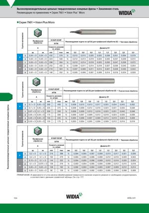 Высокопроизводительные цельные твердосплавные концевые фрезы Группа материаловГруппа материаловГруппа материалов Высокопроизводительные цельные твердосплавные концевые фрезы • Закаленная сталь Рекомендации по применению • Серия 7N01 • Vision Plus™ Micro nnСерия 7N01 • Vision Plus Micro Профильнаяобработка K10UF-DCHP Рекомендуемая подача на зуб (fz) для профильной обработки (A) — Чистовая обработкаAlTiN A Скорость резанияvc, м/мин Диаметр D1 ap ae min max мм 0,5 0,6 0,8 1,0 1,5 2,0 2,5 3,0 3 0,04 × D 0,04 × D 432 - 576 fz 0,012 0,015 0,020 0,025 0,038 0,051 0,064 0,078 P 4 0,04 × D 0,04 × D 324 - 540 fz 0,012 0,014 0,019 0,023 0,035 0,047 0,059 0,072 1 0,03 × D 0,03 × D 288 - 504 fz 0,012 0,014 0,019 0,023 0,035 0,047 0,059 0,072 2 0,03 × D 0,03 × D 252 - 432 fz 0,009 0,011 0,014 0,018 0,027 0,036 0,045 0,054 H 3 0,02 × D 0,02 × D 216 - 324 fz 0,007 0,008 0,011 0,014 0,021 0,028 0,035 0,043 4 0,02 × D 0,02 × D 180 - 252 fz 0,005 0,006 0,007 0,009 0,014 0,019 0,024 0,028 Профильнаяобработка K10UF-DCHP Рекомендуемая подача на зуб (fz) для профильной обработки (A) — Получистовая обработкаAlTiN A Скорость резанияvc, м/мин Диаметр D1 ap ae min max мм 0,5 0,6 0,8 1,0 1,5 2,0 2,5 3,0 3 0,1 × D 0,05 × D 300 - 400 fz 0,008 0,010 0,013 0,017 0,025 0,034 0,043 0,052 P 4 0,1 × D 0,05 × D 225 - 375 fz 0,008 0,009 0,012 0,016 0,023 0,031 0,040 0,048 1 0,07 × D 0,1 × D 200 - 350 fz 0,008 0,009 0,012 0,016 0,023 0,031 0,040 0,048 2 0,05 × D 0,04 × D 175 - 300 fz 0,006 0,007 0,009 0,012 0,018 0,024 0,030 0,036 H 3 0,03 × D 0,03 × D 150 - 225 fz 0,005 0,006 0,007 0,009 0,014 0,019 0,024 0,028 4 0,03 × D 0,03 × D 125 - 175 fz 0,003 0,004 0,005 0,006 0,009 0,012 0,016 0,019 Профильнаяобработка K10UF-DCHP Рекомендуемая подача на зуб (fz) для профильной обработки (A) — Черновая обработкаAlTiN A Скорость резанияvc, м/мин Диаметр D1 ap ae min max мм 0,5 0,6 0,8 1,0 1,5 2,0 2,5 3,0 3 0,2 × D 0,1 × D 216 - 288 fz 0,004 0,005 0,007 0,008 0,013 0,017 0,021 0,026 P 4 0,2 × D 0,1 × D 162 - 270 fz 0,004 0,005 0,006 0,008 0,012 0,016 0,020 0,024 1 0,15 × D 0,1 × D 144 - 252 fz 0,004 0,005 0,006 0,008 0,012 0,016 0,020 0,024 2 0,1 × D 0,075 × D 126 - 216 fz 0,003 0,004 0,005 0,006 0,009 0,012 0,015 0,018 H 3 0,05 × D 0,05 × D 108 - 162 fz 0,002 0,003 0,004 0,005 0,007 0,009 0,012 0,014 4 0,05 × D 0,05 × D 90 - 126 fz 0,002 0,002 0,002 0,003 0,005 0,006 0,008 0,009 ПРИМЕЧАНИЕ. В зависимости от угла наклона обрабатываемой поверхности значение скорости резания vc необходимо скорректировать в соответствии с данными справочной таблицы. См. стр. 177. 154 widia.com