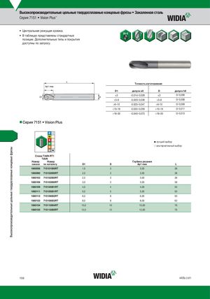 Высокопроизводительные цельные твердосплавные концевые фрезы • Закаленная сталь Серия 7151 • Vision Plus™ • Ц ентральная режущая кромка. • В таблицах представлены стандартные позиции. Дополнительные типы и покрытия доступны по запросу. Tочность изготовления D1 допуск e8 D допуск h6 ≤3 -0,014/-0,028 ≤3 0/-0,006 >3–6 -0,020/-0,038 >3–6 0/-0,008 >6–10 -0,025/-0,047 >6–10 0/-0,009 >10–18 -0,032/-0,059 >10–18 0/-0,011 >18–30 -0,040/-0,073 >18–30 0/-0,013 nnСерия 7151 • Vision Plus лучший выбор альтернативный выбор СплTаiвAlTNiA-RlNT-1RT1 TiAlN Номер Номер Глубина резания заказа по каталогу D1 D Ap1 max L 1860036 715101000RT 1,0 3 3,00 38 1860090 715102000RT 2,0 3 3,00 38 1860103 715102500RT 2,5 3 3,00 38 1860106 715103000RT 3,0 3 3,00 38 1860109 715104001RT 4,0 4 4,00 50 1860111 715105001RT 5,0 5 5,00 50 1860112 715106002RT 6,0 6 6,00 50 1860133 715108003RT 8,0 8 8,00 63 1860134 715110004RT 10,0 10 10,00 76 1860135 715112005RT 12,0 12 12,00 76 156 widia.com Высокопроизводительные цельные твердосплавные концевые фрезы