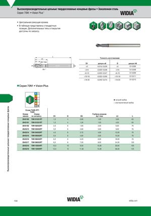 Высокопроизводительные цельные твердосплавные концевые фрезы • Закаленная сталь Серия 70N1 • Vision Plus™ • Центральная режущая кромка. • В таблицах представлены стандартные позиции. Дополнительные типы и покрытия доступны по запросу. Tочность изготовления D1 допуск e8 D допуск h6 ≤3 -0,014/-0,028 ≤3 0/-0,006 >3–6 -0,020/-0,038 >3–6 0/-0,008 >6–10 -0,025/-0,047 >6–10 0/-0,009 >10–18 -0,032/-0,059 >10–18 0/-0,011 >18–30 -0,040/-0,073 >18–30 0/-0,013 nnСерия 70N1 • Vision Plus лучший выбор альтернативный выбор СплTаiAвlNTiA- lRNT-1RT1 TiAlN Номер Номер Глубина резания заказа по каталогу D1 D D3 Ap1 max L3 L 2545190 70N101001RT 1,0 4 0,80 1,00 3,00 63 2545191 70N101501RT 1,5 4 1,30 1,50 4,50 63 2545192 70N102002RT 2,0 6 1,80 2,00 6,00 76 2545213 70N103002RT 3,0 6 2,80 3,00 9,00 76 2545214 70N104002RT 4,0 6 3,70 4,00 12,00 76 2545215 70N105002RT 5,0 6 4,60 5,00 15,00 76 2545216 70N106002RT 6,0 6 5,50 6,00 18,00 76 2545217 70N108003RT 8,0 8 7,50 8,00 24,00 100 2545218 70N110004RT 10,0 10 9,50 10,00 30,00 100 2545219 70N112005RT 12,0 12 11,50 12,00 36,00 125 158 widia.com Высокопроизводительные цельные твердосплавные концевые фрезы