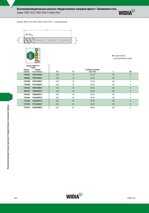 Высокопроизводительные цельные твердосплавные концевые фрезы • Закаленная сталь Серии 7505 7515 7525 7545 • Vision Plus™ (Серии 7505 7515 7525 7545 • Vision Plus — продолжение) L D1 D лучший выбор альтернативный выбор СплTаiAвlNTiA- lLNT-1LT1 TiAlN Номер Номер Глубина резания заказа по каталогу D1 D Ap1 max L ZU 1724531 752512005LT 12,0 12 42,00 125 6 1860606 754516006LT 16,0 16 24,00 89 4 1724466 750516006LT 16,0 16 24,00 125 4 1724483 751516006LT 16,0 16 40,00 125 6 1724533 752516006LT 16,0 16 56,00 125 6 1860607 754520007LT 20,0 20 30,00 104 4 1724467 750520007LT 20,0 20 30,00 150 4 1724484 751520007LT 20,0 20 50,00 150 6 1724536 752520007LT 20,0 20 70,00 150 6 1747878 751525008LT 25,0 25 63,00 150 6 1747931 752525008LT 25,0 25 88,00 150 6 160 widia.com Высокопроизводительные цельные твердосплавные концевые фрезы
