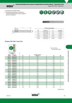 Высокопроизводительные цельные твердосплавные концевые фрезы • Закаленная сталь Серии 7585 7595 • Vision Plus™ • Центральная режущая кромка. • В таблицах представлены стандартные позиции. Дополнительные типы и покрытия доступны по запросу. Tочность изготовления D1 допуск e8 D допуск h6 ≤3 -0,014/-0,028 ≤3 0/-0,006 >3–6 -0,020/-0,038 >3–6 0/-0,008 >6–10 -0,025/-0,047 >6–10 0/-0,009 >10–18 -0,032/-0,059 >10–18 0/-0,011 >18–30 -0,040/-0,073 >18–30 0/-0,013 nnСерии 7585 7595 • Vision Plus лучший выбор альтернативный выбор СплTаiAвlNTiA- lLNT-1LT1 TiAlN Номер Номер Глубина резания заказа по каталогу D1 D Ap1 max L Re ZU 2540317 759503002LT 3,0 6 4,50 50 0,25 4 2540318 759503012LT 3,0 6 4,50 50 0,50 4 2540319 759504002LT 4,0 6 6,00 50 0,25 4 2540320 759504012LT 4,0 6 6,00 50 0,50 4 2540321 759505002LT 5,0 6 7,50 50 0,25 4 2540322 759505012LT 5,0 6 7,50 50 0,50 4 1862105 759506002LT 6,0 6 9,00 50 0,25 4 1862106 759506012LT 6,0 6 9,00 50 0,50 4 2541273 759506022LT 6,0 6 9,00 50 0,75 4 2541274 759506032LT 6,0 6 9,00 50 1,00 4 1860609 758506002LT 6,0 6 9,00 76 0,25 4 1860610 758506012LT 6,0 6 9,00 76 0,50 4 1862107 759508003LT 8,0 8 12,00 63 0,50 4 2541275 759508023LT 8,0 8 12,00 63 0,75 4 1862108 759508013LT 8,0 8 12,00 63 1,00 4 2541276 759508033LT 8,0 8 12,00 63 1,50 4 1860611 758508003LT 8,0 8 12,00 100 0,50 4 1860612 758508013LT 8,0 8 12,00 100 1,00 4 1862109 759510004LT 10,0 10 15,00 76 0,50 4 1862110 759510014LT 10,0 10 15,00 76 1,00 4 (продолжение) widia.com 161 Высокопроизводительные цельные твердосплавные концевые фрезы