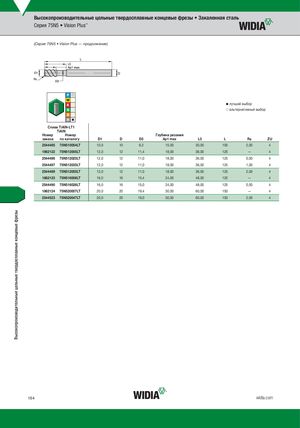 Высокопроизводительные цельные твердосплавные концевые фрезы • Закаленная сталь Серия 75N5 • Vision Plus™ (Серия 75N5 • Vision Plus — продолжение) лучший выбор альтернативный выбор СплTаiAвlNTiA- lLNT-1LT1 TiAlN Номер Номер Глубина резания заказа по каталогу D1 D D3 Ap1 max L3 L Re ZU 2544485 75N510054LT 10,0 10 9,2 15,00 30,00 100 2,00 4 1862122 75N512005LT 12,0 12 11,4 18,00 36,00 125 — 4 2544486 75N512025LT 12,0 12 11,0 18,00 36,00 125 0,50 4 2544487 75N512035LT 12,0 12 11,0 18,00 36,00 125 1,00 4 2544489 75N512055LT 12,0 12 11,0 18,00 36,00 125 2,00 4 1862123 75N516006LT 16,0 16 15,4 24,00 48,00 125 — 4 2544490 75N516026LT 16,0 16 15,0 24,00 48,00 125 0,50 4 1862124 75N520007LT 20,0 20 19,4 30,00 60,00 150 — 4 2544523 75N520047LT 20,0 20 19,0 30,00 60,00 150 2,00 4 164 widia.com Высокопроизводительные цельные твердосплавные концевые фрезы