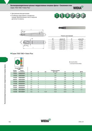 Высокопроизводительные цельные твердосплавные концевые фрезы • Закаленная сталь Серии 7050 7060 • Vision Plus™ • Центральная режущая кромка. • В таблицах представлены стандартные позиции. Дополнительные типы и покрытия доступны по запросу. Tочность изготовления D1 допуск e8 D допуск h6 ≤3 -0,014/-0,028 ≤3 0/-0,006 >3–6 -0,020/-0,038 >3–6 0/-0,008 >6–10 -0,025/-0,047 >6–10 0/-0,009 >10–18 -0,032/-0,059 >10–18 0/-0,011 >18–30 -0,040/-0,073 >18–30 0/-0,013 nnСерии 7050 7060 • Vision Plus лучший выбор альтернативный выбор СплTаiAвlNTiA- lRNT-R1 T1 TiAlN Номер Номер Глубина резания заказа по каталогу D1 D D3 Ap1 max L3 L BETA 1724321 705002001RT 2,0 4 — 2,00 2,00 63 2,5 1724323 705003002RT 3,0 6 — 3,00 3,00 75 2,5 1724324 705004002RT 4,0 6 — 4,00 4,00 75 2,5 2495916 706004002RT 4,0 6 — 4,00 4,00 75 1,5 1724325 705005002RT 5,0 6 — 5,00 5,00 75 2,5 1724326 705006004RT 6,0 10 — 6,00 6,00 100 2,5 2495918 706006004RT 6,0 10 — 6,00 6,00 100 1,5 1724327 705008004RT 8,0 10 — 8,00 8,00 100 2,5 1724328 705010005RT 10,0 12 — 10,00 10,00 125 2,5 1724330 705016006RT 16,0 16 15,00 16,00 48,00 125 — 166 widia.com Высокопроизводительные цельные твердосплавные концевые фрезы