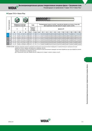 Группа материалов Высокопроизводительные цельные твердосплавные концевые фрезы Высокопроизводительные цельные твердосплавные концевые фрезы • Закаленная сталь Рекомендации по применению • Серии 7515 • Vision Plus™ nnСерия 7515 • Vision Plus Обработка уступов (A)и обработка пазов (B)TiAlNРекомендуемая подача на зуб (fz = мм/зуб) для обработки уступов и стенок (A).Для прорезания пазов (B) подачу fz следует снизить на 20%. Скорость A B резания Диаметр D1 vc, м/мин ap ae ap min max мм 3,0 4,0 5,0 6,0 8,0 10,0 12,0 16,0 20,0 25,0 3 2×D 0,3 × D 0,75 × D 160 – 180 fz 0,019 0,026 0,033 0,040 0,055 0,067 0,077 0,096 0,111 0,125 P 4 2×D 0,25 × D 0,5 × D 140 – 160 fz 0,017 0,024 0,030 0,036 0,049 0,059 0,069 0,084 0,097 0,107 1 2×D 0,25 × D 0,5 × D 120 – 140 fz 0,017 0,024 0,030 0,036 0,049 0,059 0,069 0,084 0,097 0,107 2 2×D 0,2 × D 0,4 × D 80 – 130 fz 0,013 0,018 0,022 0,027 0,037 0,044 0,051 0,063 0,071 0,078 H 3 2×D 0,1 × D 0,2 × D 70 – 100 fz 0,010 0,014 0,018 0,021 0,029 0,035 0,041 0,051 0,059 0,067 4 2×D 0,05 × D 0,05 × D 50 – 70 fz 0,007 0,009 0,012 0,014 0,019 0,023 0,027 0,034 0,039 0,044 ПРИМЕЧАНИЕ. Нижнее значение скорости резания используется при выполнении операций со съемом большого припуска или при обработке более твердых материалов в пределах группы. Верхнее значение скорости резания используется при выполнении операций чистовой обработки или при обработке менее твердых материалов в пределах группы. Для повышения качества обработанной поверхности следует снизить подачу на зуб. widia.com 171