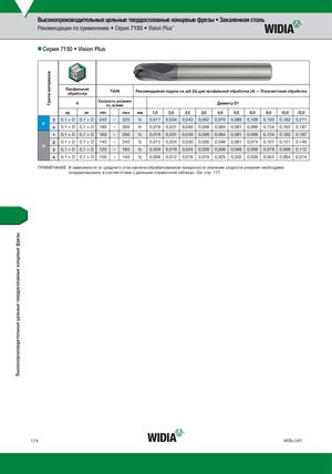 Высокопроизводительные цельные твердосплавные концевые фрезы Группа материалов Высокопроизводительные цельные твердосплавные концевые фрезы • Закаленная сталь Рекомендации по применению • Серия 7150 • Vision Plus™ nnСерия 7150 • Vision Plus Профильнаяобработка TiAlN Рекомендуемая подача на зуб (fz) для профильной обработки (A) — Получистовая обработка A Скорость резанияvc, м/мин Диаметр D1 ap ae min max мм 1,0 2,0 2,5 3,0 4,0 5,0 6,0 8,0 10,0 12,0 3 0,1 × D 0,1 × D 240 – 320 fz 0,017 0,034 0,043 0,052 0,070 0,089 0,109 0,150 0,182 0,211 P 4 0,1 × D 0,1 × D 180 – 300 fz 0,016 0,031 0,040 0,048 0,064 0,081 0,099 0,134 0,162 0,187 1 0,1 × D 0,1 × D 160 – 280 fz 0,016 0,031 0,040 0,048 0,064 0,081 0,099 0,134 0,162 0,187 2 0,1 × D 0,1 × D 140 – 240 fz 0,012 0,024 0,030 0,036 0,048 0,061 0,074 0,101 0,121 0,140 H 3 0,1 × D 0,1 × D 120 – 180 fz 0,009 0,019 0,024 0,028 0,038 0,048 0,058 0,079 0,096 0,112 4 0,1 × D 0,1 × D 100 – 140 fz 0,006 0,012 0,016 0,019 0,025 0,032 0,039 0,053 0,064 0,074 ПРИМЕЧАНИЕ. В зависимости от среднего угла наклона обрабатываемой поверхности значение скорости резания необходимо скорректировать в соответствии с данными справочной таблицы. См. стр. 177. 174 widia.com