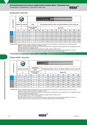 Высокопроизводительные цельные твердосплавные концевые фрезы Группа материаловГруппа материалов Высокопроизводительные цельные твердосплавные концевые фрезы • Закаленная сталь Рекомендации по применению • Серия D618 • Vision Plus™ nnСерия D618 • Vision Plus Обработка уступов (A) TiAlN Рекомендуемая подача на зуб (fz = мм/зуб) для обработки уступов и стенок (A). A Скорость резанияvc, м/мин Диаметр D1 ap ae min max мм 3,0 4,0 5,0 6,0 8,0 10,0 12,0 16,0 20,0 3 2×D 0,15 × D 120 – 160 fz 0,019 0,026 0,033 0,040 0,055 0,067 0,077 0,096 0,111 P 4 2×D 0,15 × D 90 – 150 fz 0,017 0,024 0,030 0,036 0,049 0,059 0,069 0,084 0,097 1 2×D 0,15 × D 80 – 140 fz 0,017 0,024 0,030 0,036 0,049 0,059 0,069 0,084 0,097 2 2×D 0,15 × D 70 – 120 fz 0,013 0,018 0,022 0,027 0,037 0,044 0,051 0,063 0,071 H 3 2×D 0,1 × D 60 – 90 fz 0,010 0,014 0,018 0,021 0,029 0,035 0,041 0,051 0,059 4 2×D 0,05 × D 50 – 70 fz 0,007 0,009 0,012 0,014 0,019 0,023 0,027 0,034 0,039 ПРИМЕЧАНИЕ. Нижнее значение скорости резания используется при выполнении операций со съемом большого припуска или при обработке более твердых материалов в пределах группы. Верхнее значение скорости резания используется при выполнении операций чистовой обработки или при обработке менее твердых материалов в пределах группы. Для повышения качества обработанной поверхности следует снизить подачу на зуб. Верхние значения скоростей соответствуют идеальным условиям. При использовании фрез диаметром >12 мм на обрабатывающих центрах невысокой мощности требуется корректировка режимов резания. Рекомендации по применению • Серии 422831 • Vision Plus nnСерии 422831 • Vision Plus K10UF-DCHP Обработка уступов (A) Рекомендуемая подача на зуб (fz = мм/зуб) для обработки уступов и стенок (A). AlTiN A Скорость резанияvc, м/мин Диаметр D1 ap ae min max мм 6,0 8,0 10,0 12,0 16,0 20,0 25,0 3 1,5 × D 0,2 × D 120 – 160 fz 0,040 0,055 0,067 0,077 0,096 0,111 0,125 P 4 1,5 × D 0,2 × D 90 – 150 fz 0,036 0,049 0,059 0,069 0,084 0,097 0,107 1 1,5 × D 0,2 × D 80 – 140 fz 0,036 0,049 0,059 0,069 0,084 0,097 0,107 2 1,5 × D 0,15 × D 60 – 80 fz 0,027 0,037 0,044 0,051 0,063 0,071 0,078 H 3 1,5 × D 0,1 × D 50 – 70 fz 0,021 0,029 0,035 0,041 0,051 0,059 0,067 4 1,5 × D 0,05 × D 40 – 60 fz 0,014 0,019 0,023 0,027 0,034 0,039 0,044 ПРИМЕЧАНИЕ. Нижнее значение скорости резания используется при выполнении операций со съемом большого припуска или при обработке более твердых материалов в пределах группы. Верхнее значение скорости резания используется при выполнении операций чистовой обработки или при обработке менее твердых материалов в пределах группы. Для повышения качества обработанной поверхности следует снизить подачу на зуб. Для серии 422831 ap max = 2,5 × D при 50% ae. Верхние значения скоростей соответствуют идеальным условиям. При использовании фрез диаметром >12 мм на обрабатывающих центрах невысокой мощности требуется корректировка режимов резания. 176 widia.com