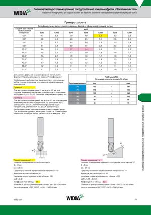 Высокопроизводительные цельные твердосплавные концевые фрезы • Закаленная сталь Поправочные коэффициенты для скорости резания при обработке закаленной стали фрезами со сферической режущей частью Примеры расчета Коэффициенты для расчета скорости резания фрезой со сферической режущей частью Средний угол наклона ap/D обрабатываемой поверхности 0,003 0,006 0,010 0,016 0,020 0,025 0,030 0,0° 9,1 6,5 5,0 4,0 3,6 3,2 2,9 3,0° 6,2 4,9 4,0 3,3 3,0 2,8 2,6 5,0° 5,1 4,2 3,5 3,0 2,8 2,5 2,4 8,0° 4,1 3,4 3,0 2,6 2,4 2,3 2,1 10,0° 3,6 3,1 2,7 2,4 2,3 2,1 2,0 15,0° 2,8 2,5 2,2 2,0 1,9 1,8 1,7 20,0° 2,3 2,1 1,9 1,8 1,7 1,6 1,6 30,0° 1,7 1,6 1,5 1,4 1,4 1,3 1,3 40,0° 1,4 1,3 1,3 1,2 1,2 1,2 1,2 50,0° 1,2 1,2 1,1 1,1 1,1 1,1 1,1 55,0° 1,1 1,1 1,1 1,1 1,1 1,0 1,0 Для расчета реальной скорости резания используйте формулу: Начальная скорость резания * Коэффициент TiAlN или AlTiN Коэффициент выбирается в зависимости от соотношения Начальная скорость резания, Vc м/мин ap/D и среднего значения угла наклона обрабатываемойповерхности. Группа материалов min max Пример 1 P3 160 – 180 Для инструмента диаметром 10 мм и ap = 0,2 мм при P4 140 – 160 среднем значении угла наклона поверхности 0° отношение H1 100 – 140 ap/D равно 0,2/10 = 0,02. Значение коэффициента равно 3,6. Пример 2 H2 70 – 120 Для инструмента диаметром 8 мм и ap = 0,1 мм при среднем H3 60 – 90 значении угла наклона поверхности 10° отношение ap/D H4 50 – 70 равно 0,1/8 = 0,0125. Значение коэффициента будет находиться в диапазоне от 2,7 до 2,4. Выберите 2,6. Необходимо также учитывать диаметр хвостовика и вылет. При вылете инструмента из патрона более 2 × D необходимо уменьшить подачу на зуб из расчета 15% на каждый 1 × D. Пример применения 1 = Пример применения 2 = торцевое фрезерование плоской поверхности торцевое фрезерование поверхности со средним углом наклона 10º D = 10 мм D = 8 мм ap = 0,2 мм ap = 0,1 мм Средний угол наклона обрабатываемой поверхности = 0° Средний угол наклона обрабатываемой поверхности = 10° Фреза для чистовой обработки H2 Фреза для чистовой обработки H2 Начальная скорость резания vc из таблицы = 100 Начальная скорость резания vc из таблицы = 100 ap/D = 0,02 ap/D = 0,1/8 = 0,0125 Коэффициент из таблицы = 3,6 Коэффициент из таблицы = 2,6 Значение vc для программирования станка = 100 * 3,6 = 360 м/мин Значение vc для программирования станка = 100 * 2,6 = 260 м/мин Частота вращения = 360* 1000/3,14/10 = 11 460 об/мин Частота вращения = 260* 1000/3,14/10 = 7640 об/мин widia.com 177 Высокопроизводительные цельные твердосплавные концевые фрезы