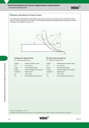 Высокопроизводительные цельные твердосплавные концевые фрезы Трохоидальное фрезерование nnСредняя и максимальная толщина стружки При традиционном фрезеровании целесообразно рассчитывать нагрузку на режущую кромку, рассчитывая среднее значение толщины стружки (hm). При работе же с минимальной шириной фрезерования (ae) целесообразно учитывать не среднее, а максимальное значение - hx. Традиционное фрезерование Интеллектуальная обработка hm = 360º/p∙fs∙ae/D∙fz∙sin x hx = 360º/p∙fs∙2∙ae/D∙fz∙sin x hm [мм] = средняя толщина стружки hx [мм] = максимальная толщина стружки fs [°] = угол контакта fs [°] = угол контакта ae [мм] = ширина фрезерования ae [мм] = ширина фрезерования D1 [мм] = наружный диаметр инструмента D1 [мм] = наружный диаметр инструмента fz [мм/зуб] = подача на зуб fz [мм/зуб] = подача на зуб c [°] = угол в плане c [°] = угол в плане l [°] = угол подъема винтовой линии * l [°] = угол подъема винтовой линии * * Цельные концевые фрезы: c = 90°-l Трохоидальное фрезерование может выполняться с использованием цельных фрез или фрез со сменными режущими пластинами. 182 widia.com Высокопроизводительные цельные твердосплавные концевые фрезы