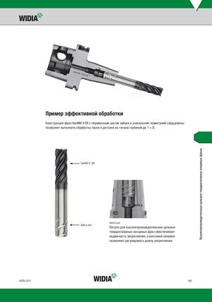 Высокопроизводительные цельные твердосплавные концевые фрезы Пример эффективной обработки Конструкция фрез VariMill II ER с переменным шагом зубьев и уникальной геометрией сердцевины позволяет выполнять обработку пазов в деталях из титана глубиной до 1 × D. VariMill II™ ER Safe-Lock™ Safe-Lock™ Патрон для высокопроизводительных цельных твердосплавных концевых фрез обеспечивает надежность закрепления, а винтовые канавки позволяют регулировать длину закрепления. widia.com 187