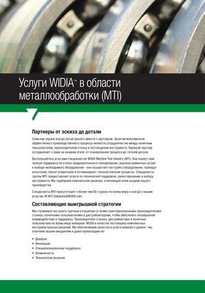 Услуги WIDIA™ в области металлообработки (MTI) Партнеры от эскиза до детали Сложные задачи всегда лучше решать вместе с партнером. Залогом максимально эффективного производственного процесса является сотрудничество между конечным пользователем, производителем станка и поставщиком инструмента. Хороший партнер сотрудничает с вами на каждом этапе, от планирования процесса до готовой детали. Воспользуйтесь услугами специалистов WIDIA Machine Tool Industry (MTI). Они окажут вам полную поддержку на этапах предварительного планирования, анализа временных затрат и выбора необходимого оборудования - они осуществят настройку оборудования, проведут испытания, обучат операторов и оптимизируют технологические процессы. Специалисты группы MTI предоставляют услуги по технической поддержке, проектированию и выбору инструмента. Мы подбираем комплексное решение, отвечающее всем нуждам вашего производства. Специалисты MTI присутствуют в более чем 60 странах по всему миру и всегда к вашим услугам: W-MTI.Solutions@WIDIA.com. Составляющие выигрышной стратегии Мы стремимся построить прочные отношения со всеми заинтересованными производителями станков, конечными пользователями и дистрибьюторами, чтобы обеспечить непрерывное взаимодействие и поддержку. Производители станков, дистрибьюторы и конечные пользователи по всему миру выбирают WIDIA в качестве поставщика комплексных инструментальных решений. Мы обеспечиваем качество и услуги мирового уровня - мы отвечаем вашим ожиданиям и даже превосходим их! • Доверие • Инновации • Специализированная поддержка • Возможности • Технические решения