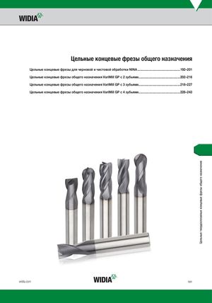 Цельные твердосплавные концевые фрезы общего назначения Цельные концевые фрезы общего назначения Цельные концевые фрезы для черновой и чистовой обработки NINA..................................................192–201 Цельные концевые фрезы общего назначения VariMill GP с 2 зубьями................................................202–216 Цельные концевые фрезы общего назначения VariMill GP с 3 зубьями................................................218–227 Цельные концевые фрезы общего назначения VariMill GP с 4 зубьями................................................228–243 widia.com 191