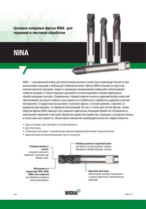 Цельные концевые фрезы NINA™ для черновой и чистовой обработки NINA NINA — экономичный выбор для обеспечения высокого качества и производительности при выполнении операций с небольшой глубиной резания. Фрезы NINA отличаются короткой компактной конструкцией, сводят к минимуму возникновение вибраций и обеспечивают плавное резание, а также подходят для работы на многоцелевых токарно-фрезерных обрабатывающих центрах. Современная твердосплавная основа и широкий выбор покрытий обеспечивают высокую стойкость инструмента и стабильность обработки широкого спектра материалов. Стандартный ассортимент включает фрезы с острой кромкой, с фаской, со радиусом при вершине, со сферической режущей частью, а также для снятия фаски, таким образом фрезы NINA подходят для широкого диапазона операций обработки. Возможность выполнения черновой и чистовой обработки одним инструментом сокращает складские запасы и число смен инструмента, обеспечивая повышение производительности и эффективности. • Один инструмент для черновой и чистовой обработки. • Доступная цена. • Стабильный инструмент с минимальным уровнем вибраций обеспечивает плавное резание. • Широкий выбор исполнений режущей части и покрытий. Плавное резание и короткий вылет Режущая кромка у для работы на многоцелевых токарно- центра фрезерных обрабатывающих центрах. позволяет выполнять сверление и врезание под любым углом. Инструменты с покрытием TiCN, AlTiN, Короткий хвостовик TiAlN и без покрытия обеспечивает высокую стабильность для обработки широкого и низкую вероятность возникновения спектра материалов. вибраций. 192 widia.com