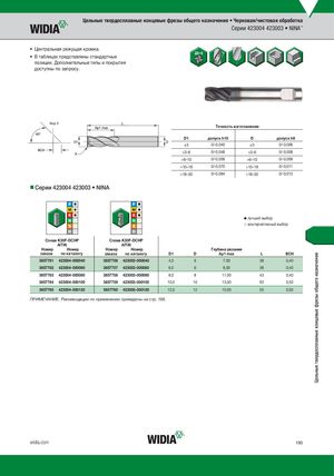 Цельные твердосплавные концевые фрезы общего назначения • Черновая/чистовая обработка Серии 423004 423003 • NINA™ • Центральная режущая кромка. • В таблицах представлены стандартные позиции. Дополнительные типы и покрытия доступны по запросу. Вид X Tочность изготовления D1 допуск h10 D допуск h6 ≤3 0/-0,040 ≤3 0/-0,006 >3–6 0/-0,048 >3–6 0/-0,008 >6–10 0/-0,058 >6–10 0/-0,009 >10–18 0/-0,070 >10–18 0/-0,011 >18–30 0/-0,084 >18–30 0/-0,013 nnСерии 423004 423003 • NINA лучший выбор альтернативный выбор CплKа3в0KF3-D0FC-HDPCHP CплKа3в0KF3-D0FC-HDPCHP AlTiN AlTiN Номер Номер Номер Номер Глубина резания заказа по каталогу заказа по каталогу D1 D Ap1 max L BCH 3657761 423004-000040 3657756 423003-000040 4,0 6 7,00 38 0,40 3657762 423004-000060 3657757 423003-000060 6,0 6 8,00 38 0,40 3657763 423004-000080 3657758 423003-000080 8,0 8 11,00 43 0,40 3657764 423004-000100 3657759 423003-000100 10,0 10 13,00 50 0,50 3657765 423004-000120 3657760 423003-000120 12,0 12 15,00 55 0,50 ПРИМЕЧАНИЕ. Рекомендации по применению приведены на стр. 199. widia.com 195 Цельные твердосплавные концевые фрезы общего назначения