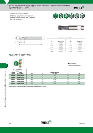 Цельные твердосплавные концевые фрезы общего назначения • Черновая/чистовая обработка Серии 423048 423047 • NINA™ • Ц ентральная режущая кромка. • В таблицах представлены стандартные позиции. Дополнительные типы и покрытия доступны по запросу. Tочность изготовления D1 допуск h10 D допуск h6 ≤3 0/-0,040 ≤3 0/-0,006 >3–6 0/-0,048 >3–6 0/-0,008 >6–10 0/-0,058 >6–10 0/-0,009 >10–18 0/-0,070 >10–18 0/-0,011 >18–30 0/-0,084 >18–30 0/-0,013 nnСерии 423048 423047 • NINA лучший выбор альтернативный выбор CплKа3в0KF3-D0FC-HDPCHP TiAlN Номер Номер Глубина резания заказа по каталогу D1 D Ap1 max L Re 2343566 423048-000030 3,0 6 5,00 38 0,50 2343568 423048-000040 4,0 6 7,00 38 0,50 2343574 423048-000080 8,0 8 11,00 43 2,00 2343576 423048-000100 10,0 10 13,00 50 3,00 2343579 423048-000120 12,0 12 15,00 55 3,00 ПРИМЕЧАНИЕ. Рекомендации по применению приведены на стр. 200. 196 widia.com Цельные твердосплавные концевые фрезы общего назначения