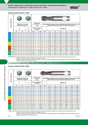 Цельные твердосплавные концевые фрезы общего назначения Группа материаловГруппа материалов Цельные твердосплавные концевые фрезы общего назначения • Черновая/чистовая обработка Рекомендации по применению • Серии 423048 423047 • NINA™ nnСерии 423048 423047 • NINA Обработка уступов (A) K30F-DCHP Рекомендуемая подача на зуб (fz = мм/зуб) для обработки уступов и стенок (A). и обработка пазов (B) AlTiN Для прорезания пазов (B) подачу fz следует снизить на 20%. A B Скорость резанияvc, м/мин Диаметр D1 ap ae ap min – max мм 4,0 5,0 6,0 8,0 10,0 12,0 0 0,75 × D 0,5 × D 0,5 × D 150 – 200 fz 0,028 0,036 0,044 0,060 0,072 0,083 1 0,75 × D 0,5 × D 0,5 × D 150 – 200 fz 0,028 0,036 0,044 0,060 0,072 0,083 P 2 0,75 × D 0,5 × D 0,5 × D 140 – 190 fz 0,028 0,036 0,044 0,060 0,072 0,083 3 0,75 × D 0,5 × D 0,5 × D 120 – 160 fz 0,023 0,030 0,036 0,050 0,061 0,070 4 0,75 × D 0,5 × D 0,5 × D 90 – 150 fz 0,021 0,027 0,033 0,045 0,054 0,062 1 0,75 × D 0,5 × D 0,5 × D 90 – 115 fz 0,023 0,030 0,036 0,050 0,061 0,070 M 2 0,75 × D 0,5 × D 0,5 × D 60 – 80 fz 0,019 0,024 0,029 0,040 0,048 0,056 1 0,75 × D 0,5 × D 0,5 × D 120 – 150 fz 0,028 0,036 0,044 0,060 0,072 0,083 K 2 0,75 × D 0,5 × D 0,5 × D 110 – 140 fz 0,023 0,030 0,036 0,050 0,061 0,070 1 0,75 × D 0,5 × D 0,5 × D 500 – 2000 fz 0,040 0,050 0,060 0,080 0,100 0,120 N 2 0,75 × D 0,5 × D 0,5 × D 500 – 1500 fz 0,036 0,045 0,054 0,072 0,090 0,108 5 0,75 × D 0,5 × D 0,5 × D 250 – 1000 fz 0,036 0,045 0,054 0,072 0,090 0,108 ПРИМЕЧАНИЕ. Нижнее значение скорости резания используется при выполнении операций со съемом большого припуска или при обработке более твердых материалов в пределах группы. Верхнее значение скорости резания используется при выполнении операций чистовой обработки или при обработке менее твердых материалов в пределах группы. Рекомендации по применению • Серии 423039 423038 • NINA nnСерии 423039 423038 • NINA Обработка уступов (A) K30F-DCHP Рекомендуемая подача на зуб (fz = мм/зуб) для обработки уступов и стенок (A). и обработка пазов (B) AlTiN Для прорезания пазов (B) подачу fz следует снизить на 20%. A B Скорость резанияvc, м/мин Диаметр D1 ap ae ap min – max мм 4,0 5,0 6,0 8,0 10,0 12,0 0 0,75 × D 0,5 × D 0,5 × D 150 - 200 fz 0,028 0,036 0,044 0,060 0,072 0,083 1 0,75 × D 0,5 × D 0,5 × D 150 - 200 fz 0,028 0,036 0,044 0,060 0,072 0,083 P 2 0,75 × D 0,5 × D 0,5 × D 140 - 190 fz 0,028 0,036 0,044 0,060 0,072 0,083 3 0,75 × D 0,5 × D 0,5 × D 120 - 160 fz 0,023 0,030 0,036 0,050 0,061 0,070 4 0,75 × D 0,5 × D 0,5 × D 90 – 150 fz 0,021 0,027 0,033 0,045 0,054 0,062 1 0,75 × D 0,5 × D 0,5 × D 90 - 115 fz 0,023 0,030 0,036 0,050 0,061 0,070 M 2 0,75 × D 0,5 × D 0,5 × D 60 - 80 fz 0,019 0,024 0,029 0,040 0,048 0,056 1 0,75 × D 0,5 × D 0,5 × D 120 - 150 fz 0,028 0,036 0,044 0,060 0,072 0,083 K 2 0,75 × D 0,5 × D 0,5 × D 110 - 140 fz 0,023 0,030 0,036 0,050 0,061 0,070 1 0,75 × D 0,5 × D 0,5 × D 500 - 2000 fz 0,040 0,050 0,060 0,080 0,100 0,120 N 2 0,75 × D 0,5 × D 0,5 × D 500 – 1500 fz 0,036 0,045 0,054 0,072 0,090 0,108 5 0,75 × D 0,5 × D 0,5 × D 250 – 1000 fz 0,036 0,045 0,054 0,072 0,090 0,108 ПРИМЕЧАНИЕ. Нижнее значение скорости резания используется при выполнении операций со съемом большого припуска или при обработке более твердых материалов в пределах группы. Верхнее значение скорости резания используется при выполнении операций чистовой обработки или при обработке менее твердых материалов в пределах группы. 200 widia.com
